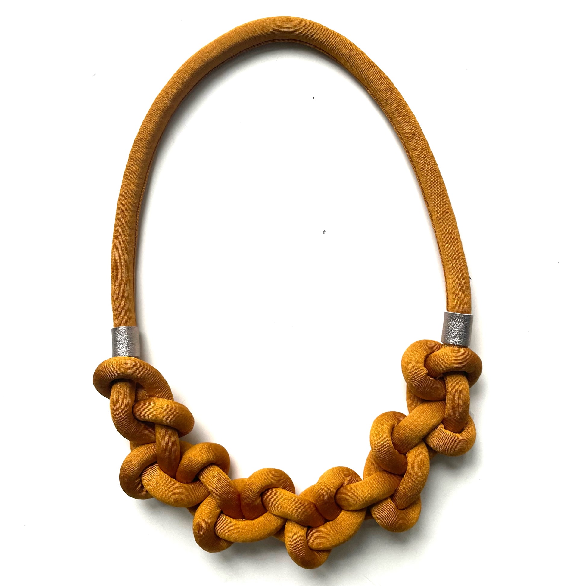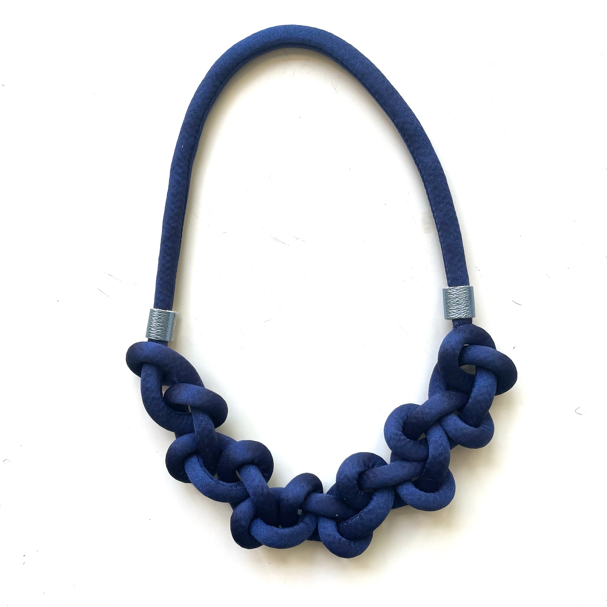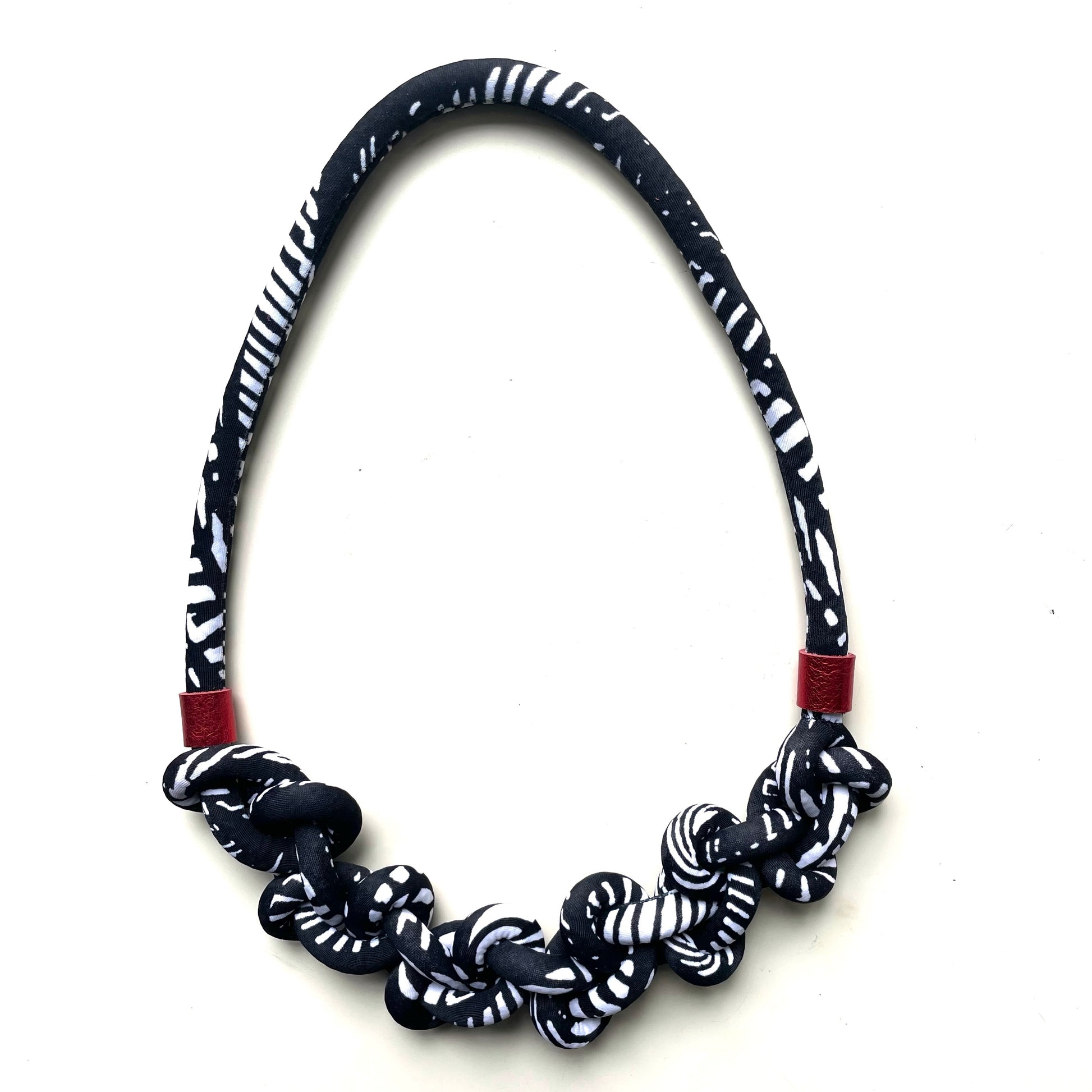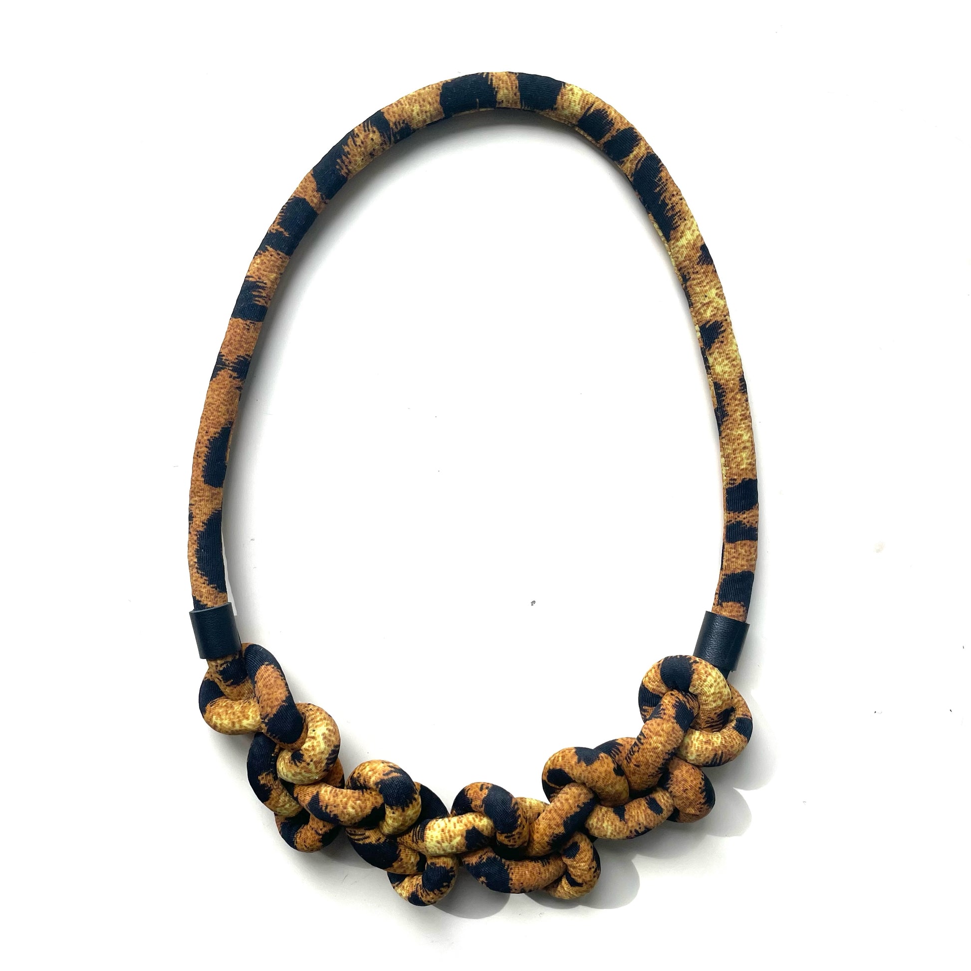 Collar de cuerda de algodón forrada con tela. Detalles de cuero. Este collar va bien con todo, muy versátil para día y noche. Además no tiene broche, entonces es muy fácil de poner e ideal para pieles sensibles a metales.