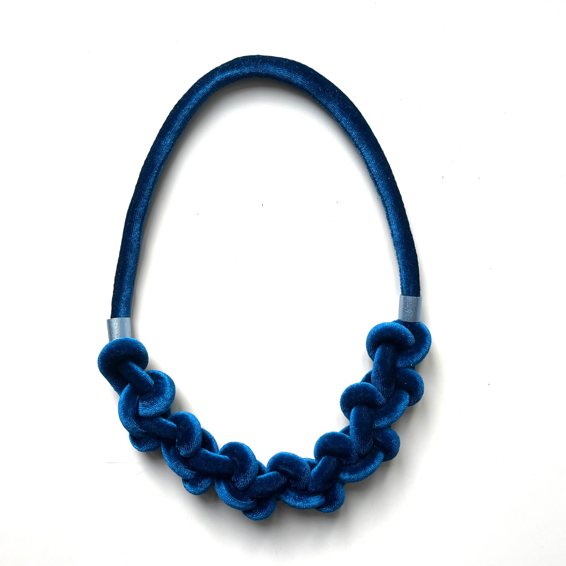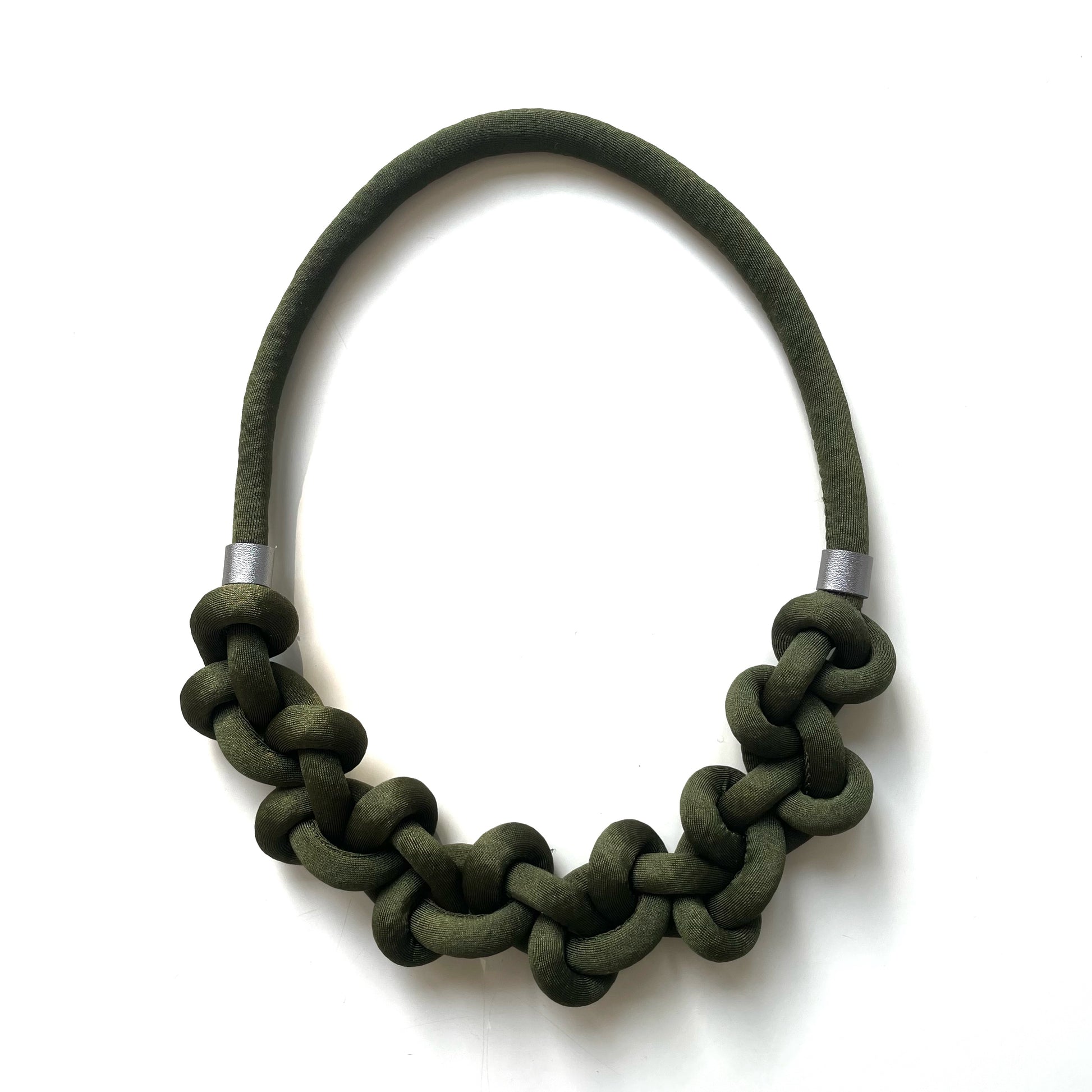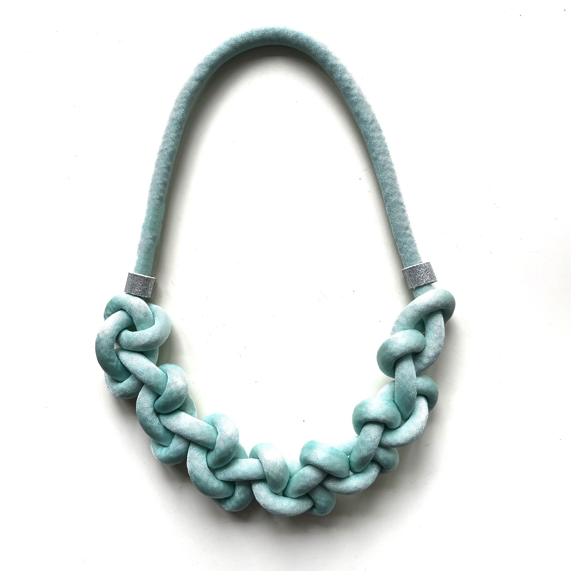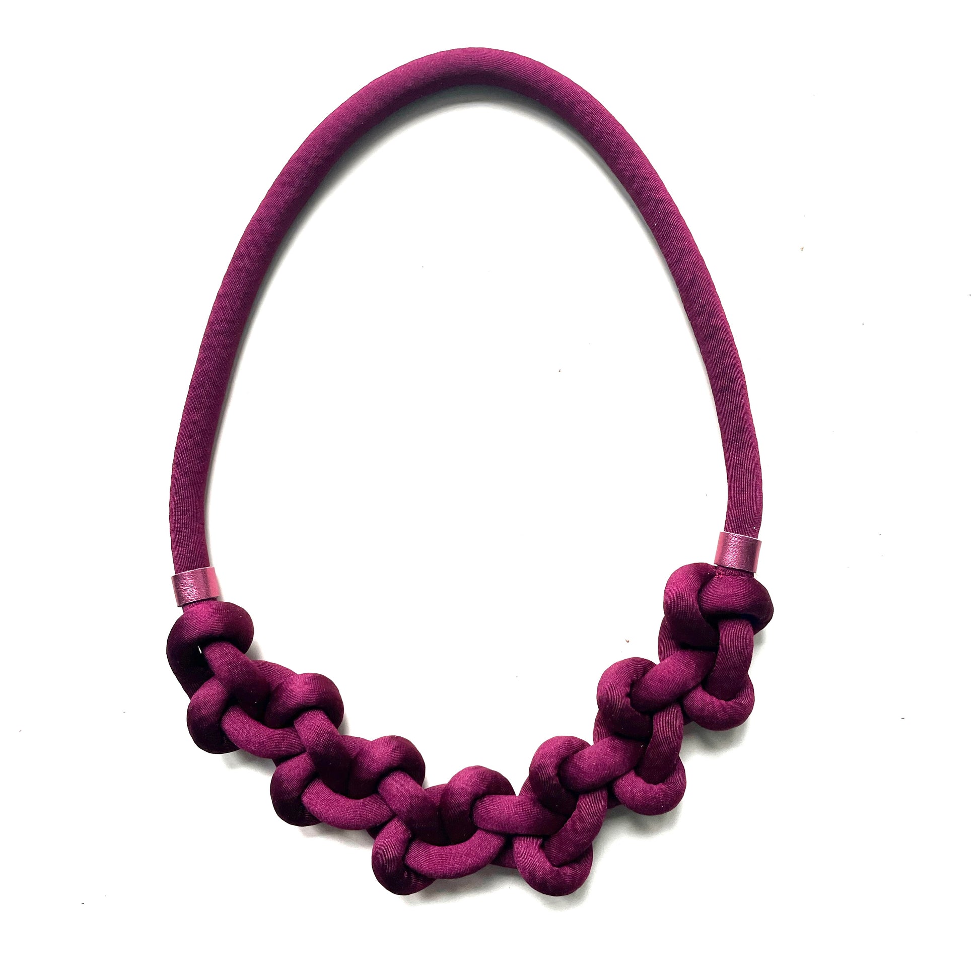 Collar de cuerda de algodón forrada con tela. Detalles de cuero. Este collar va bien con todo, muy versátil para día y noche. Además no tiene broche, entonces es muy fácil de poner e ideal para pieles sensibles a metales.