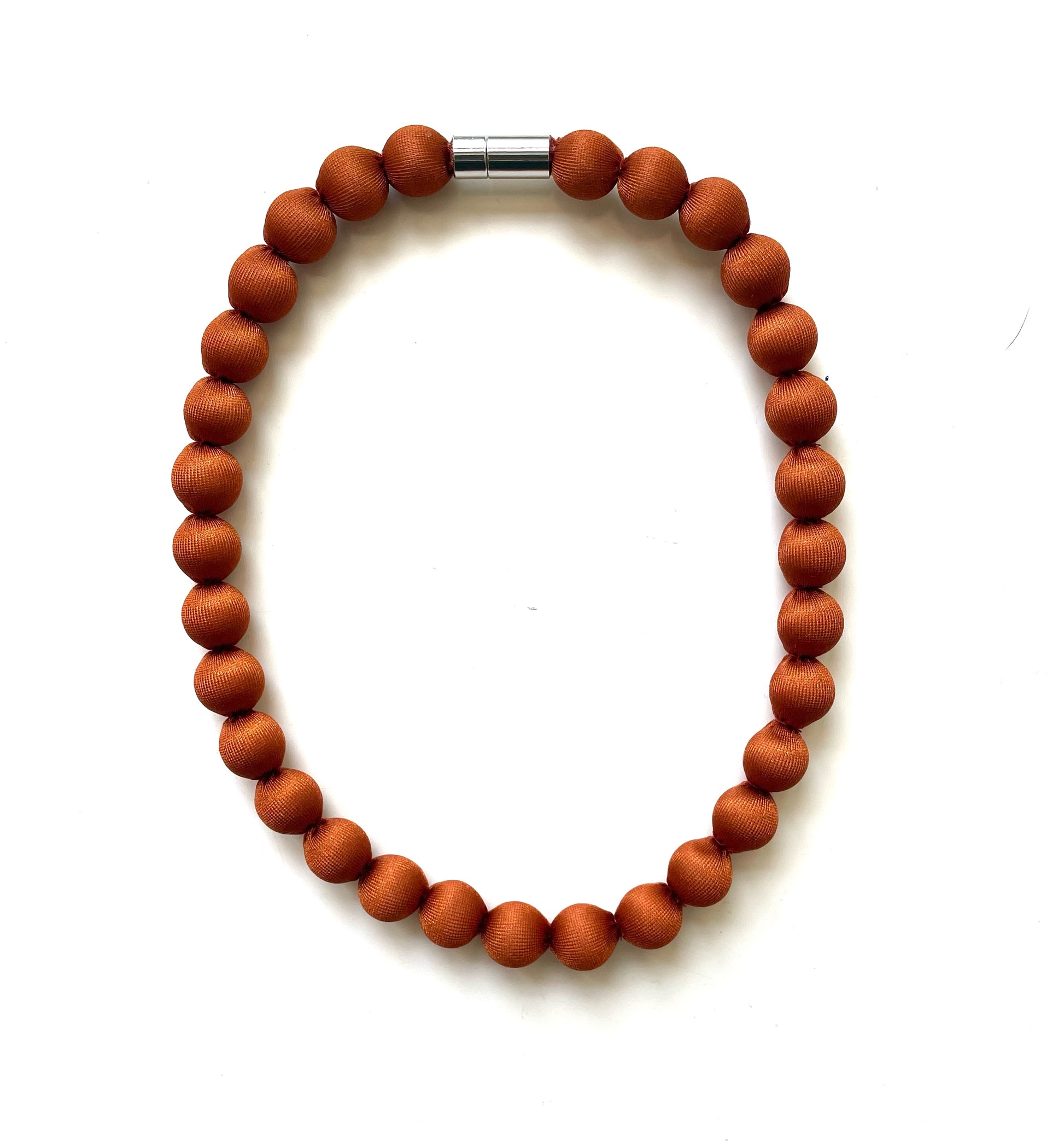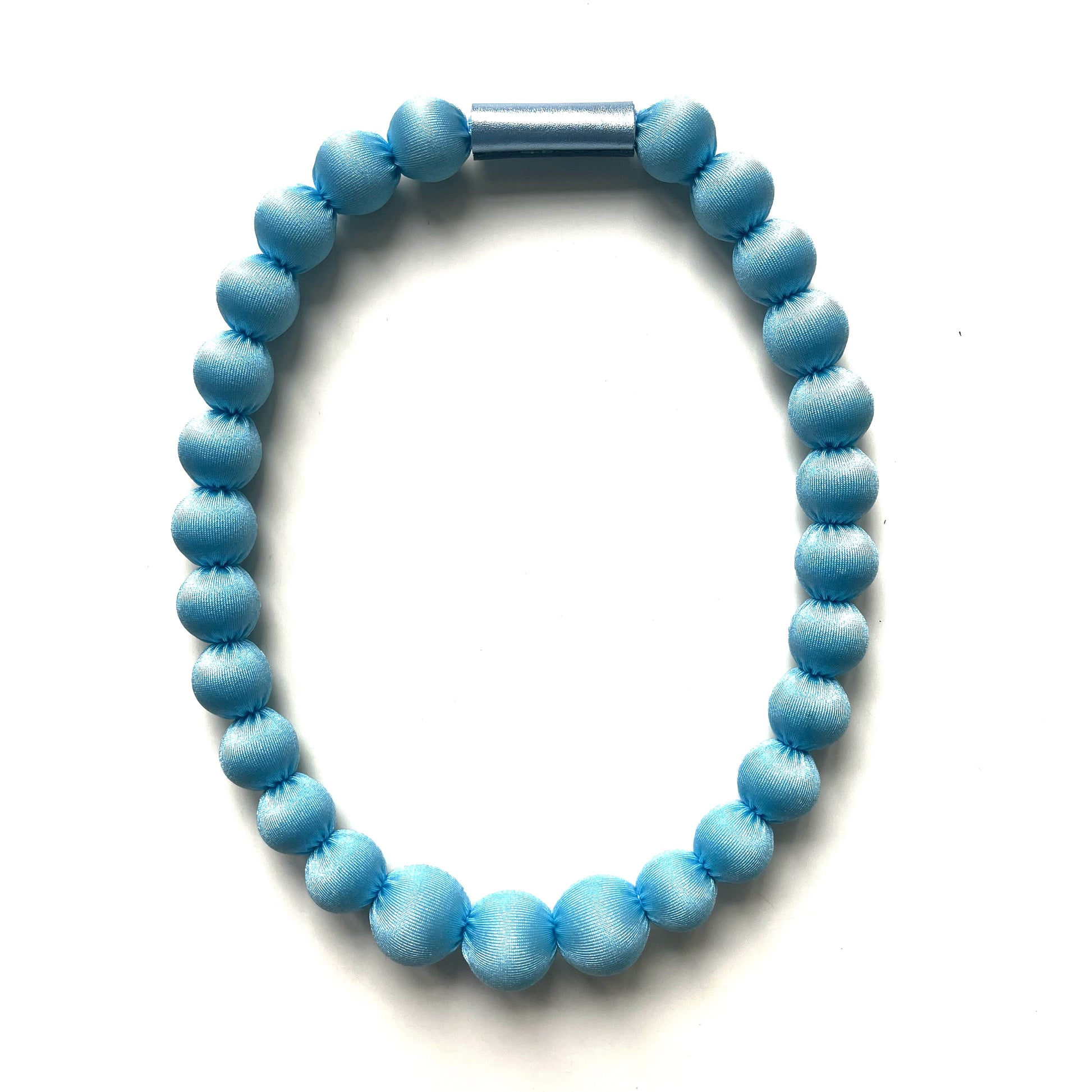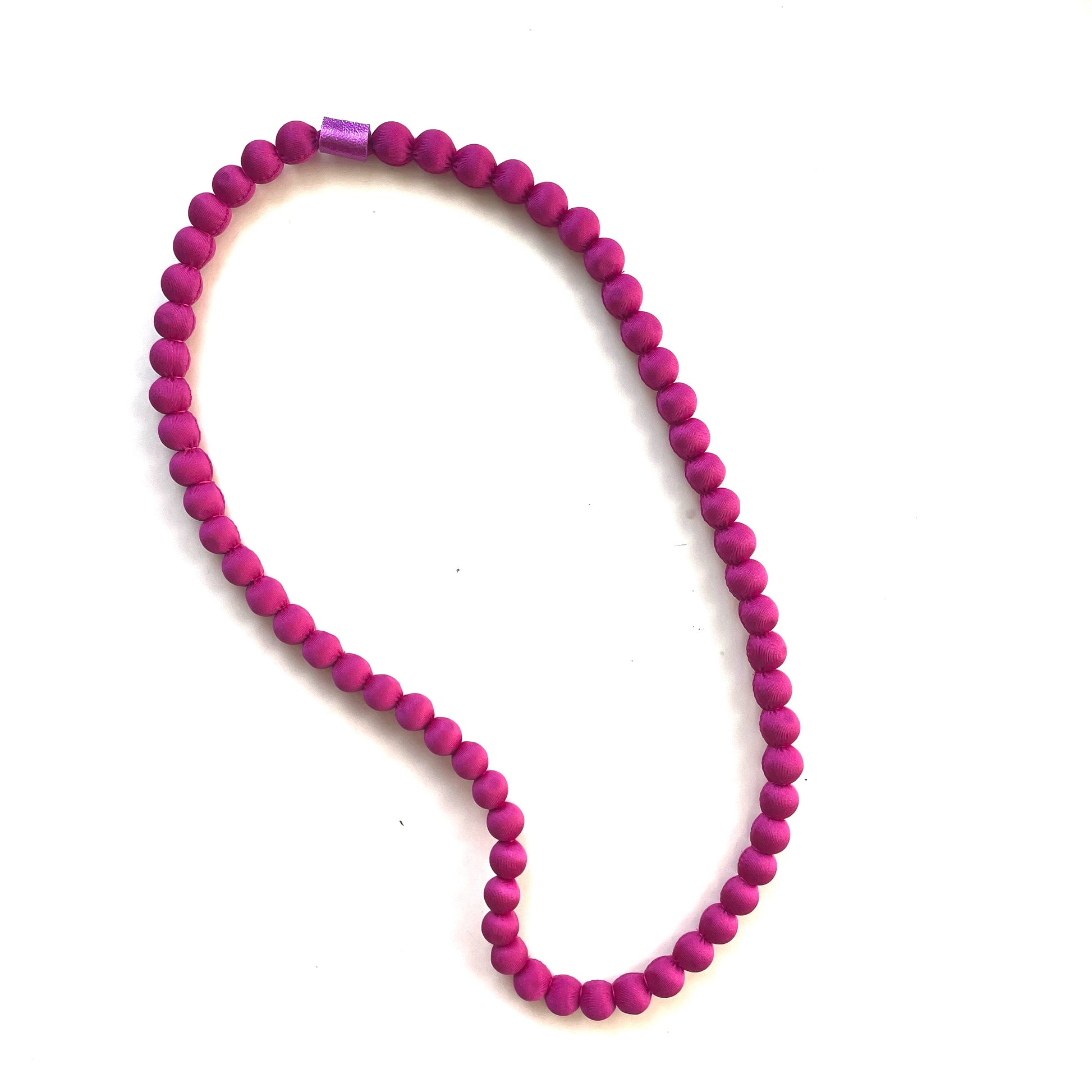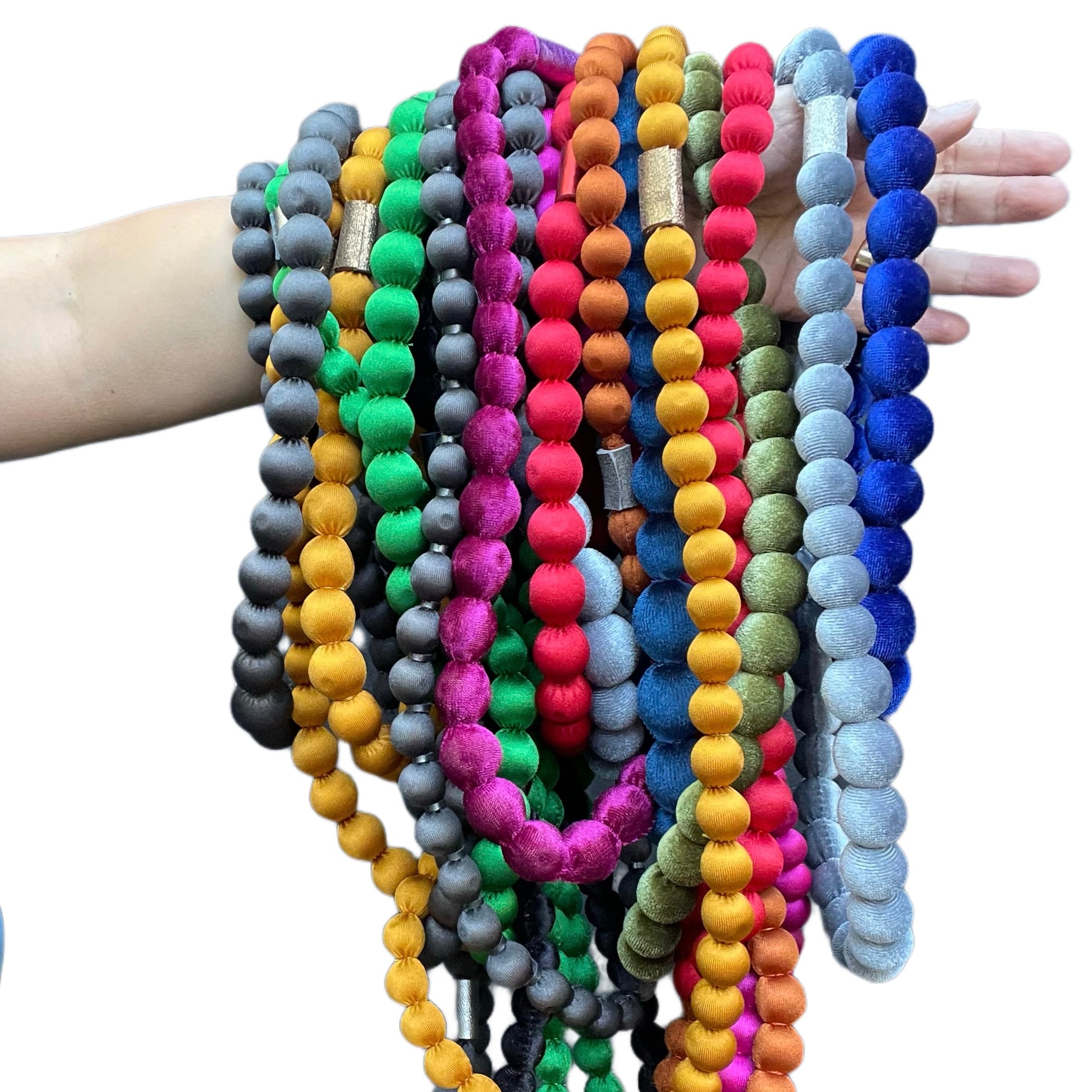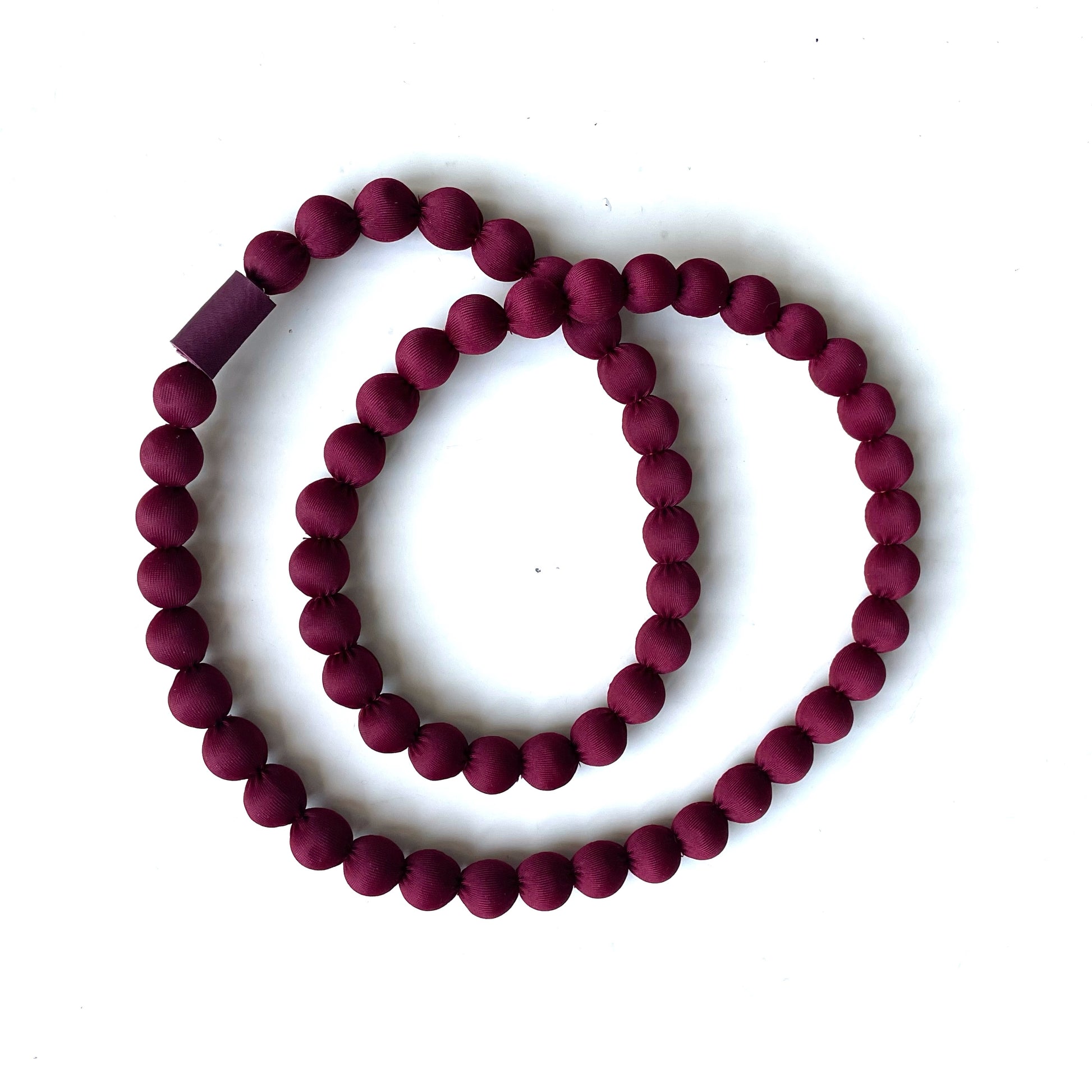 Collar de tela y pelotitas de madera. Es la versión moderna de un clásico collar de perlas. Existen cinco tamaños de cada color y los puedes mezclar para lograr combinaciones de colores, texturas y estilos.