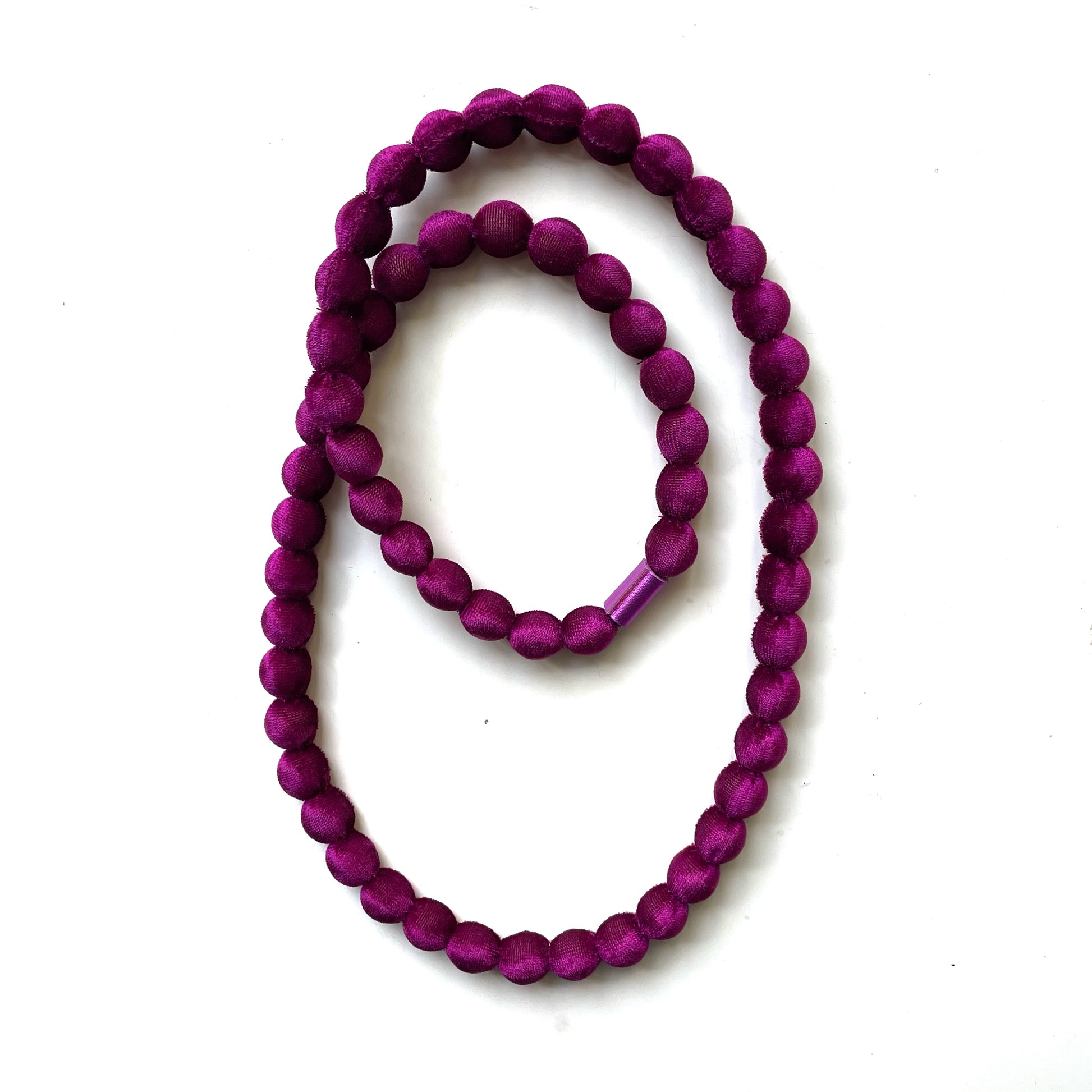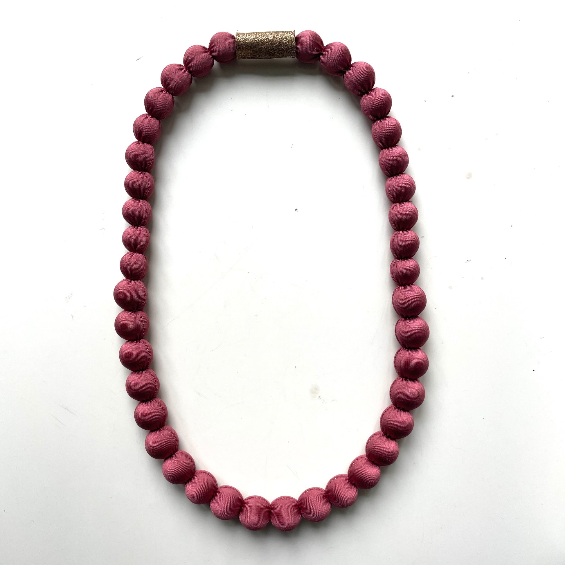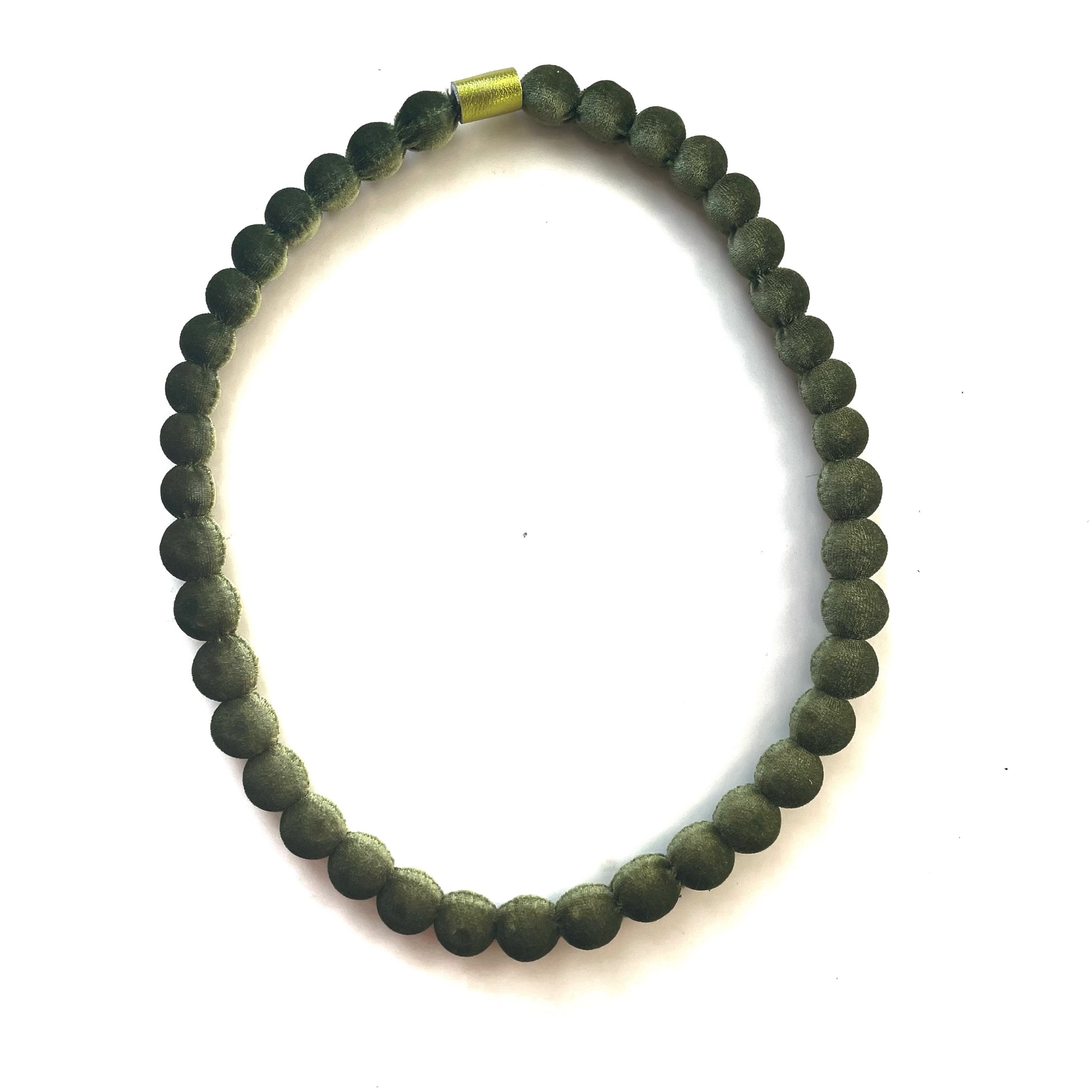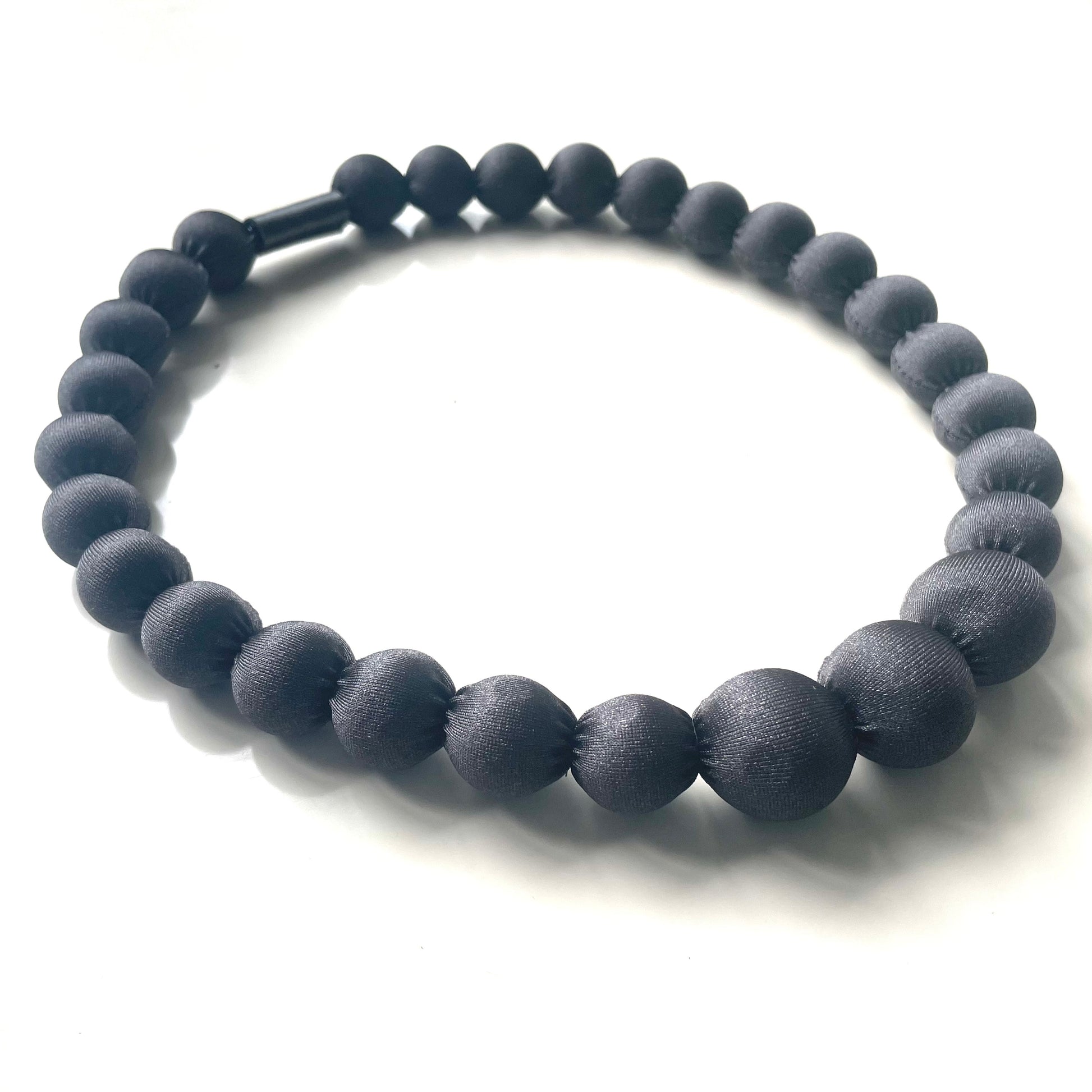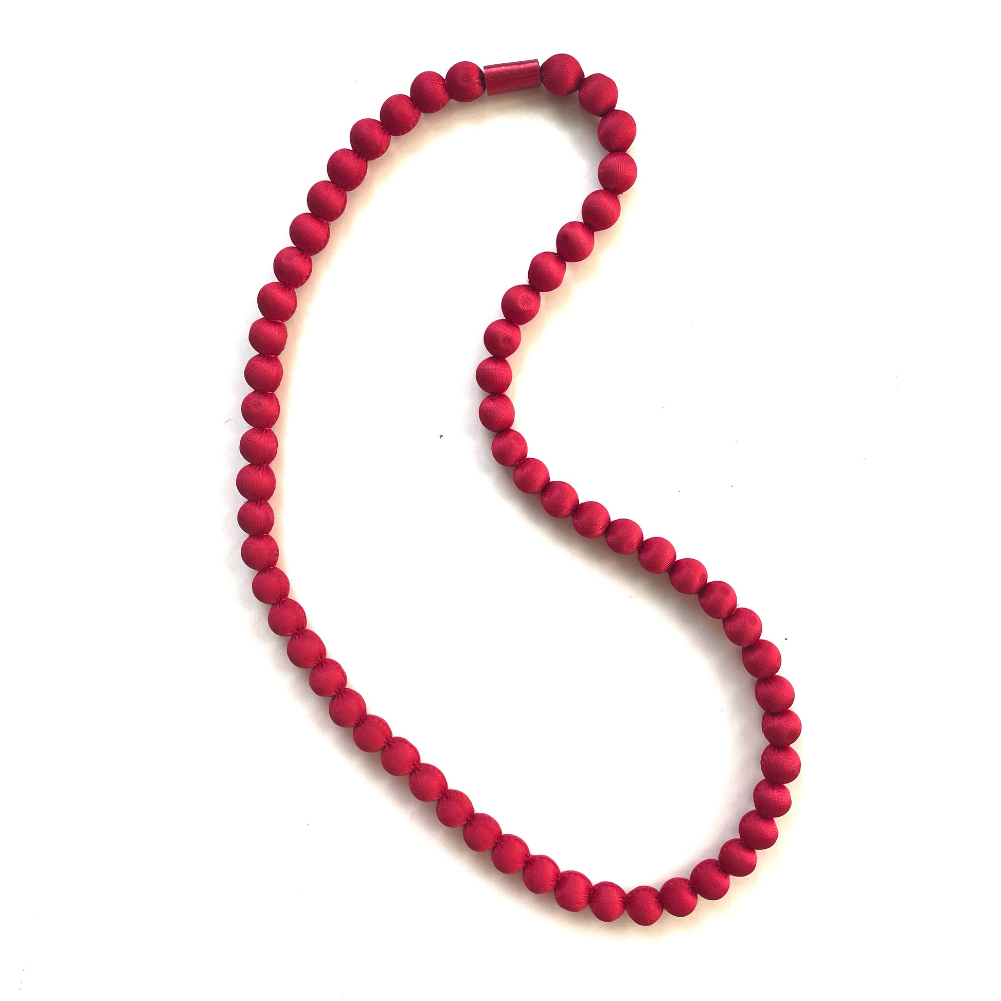 Collar de tela y pelotitas de madera. Es la versión moderna de un clásico collar de perlas. Existen cinco tamaños de cada color y los puedes mezclar para lograr combinaciones de colores, texturas y estilos.