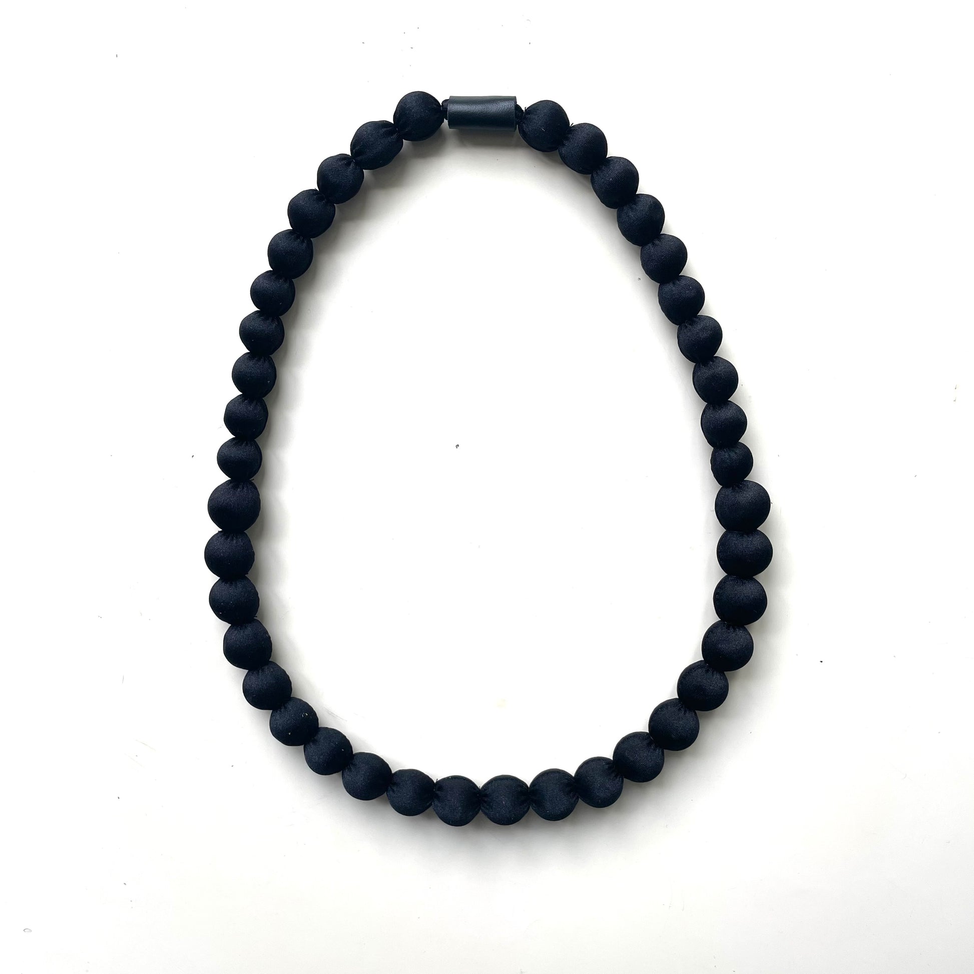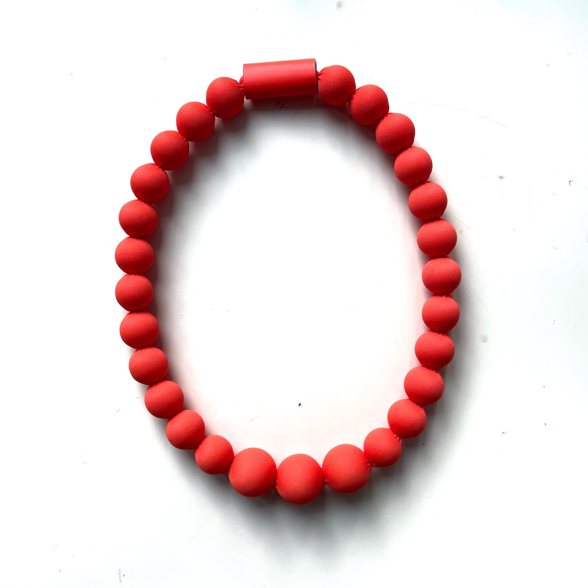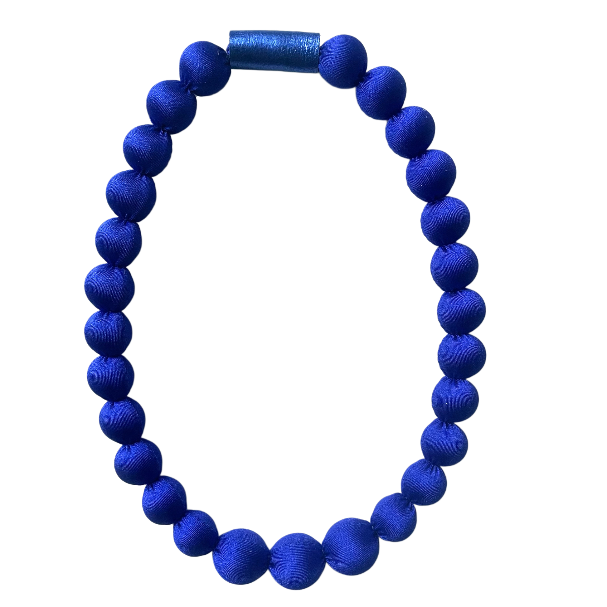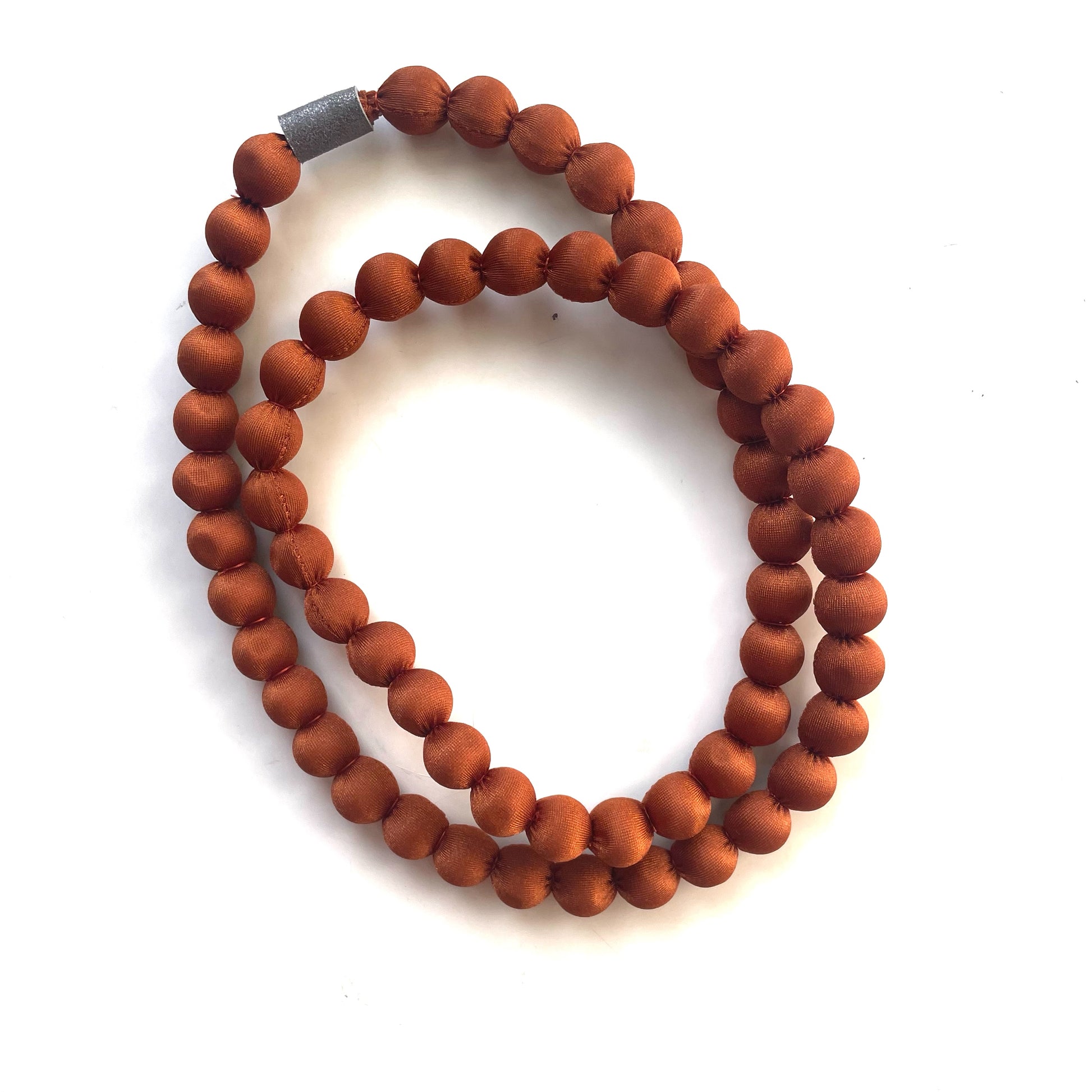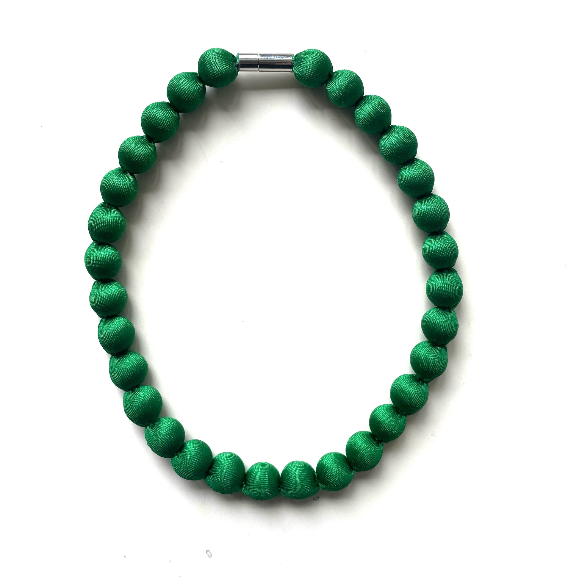 Collar de tela y pelotitas de madera. Es la versión moderna de un clásico collar de perlas. Existen cinco tamaños de cada color y los puedes mezclar para lograr combinaciones de colores, texturas y estilos.
