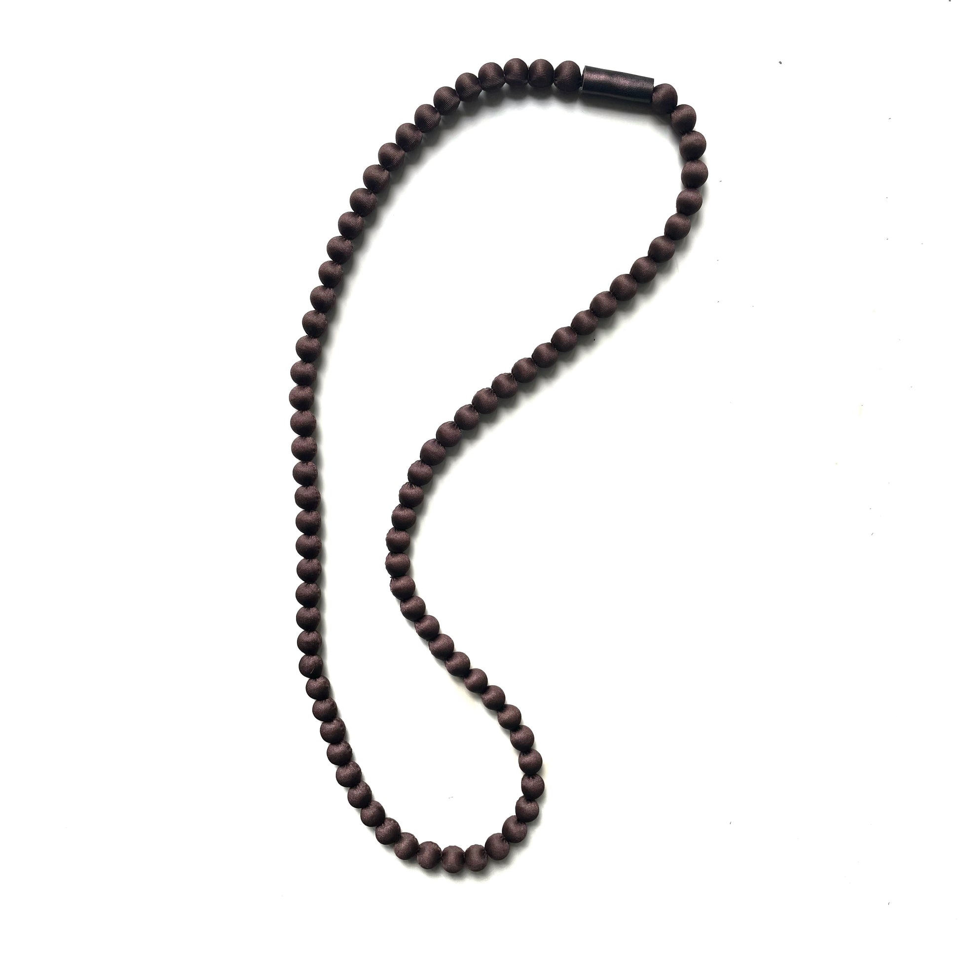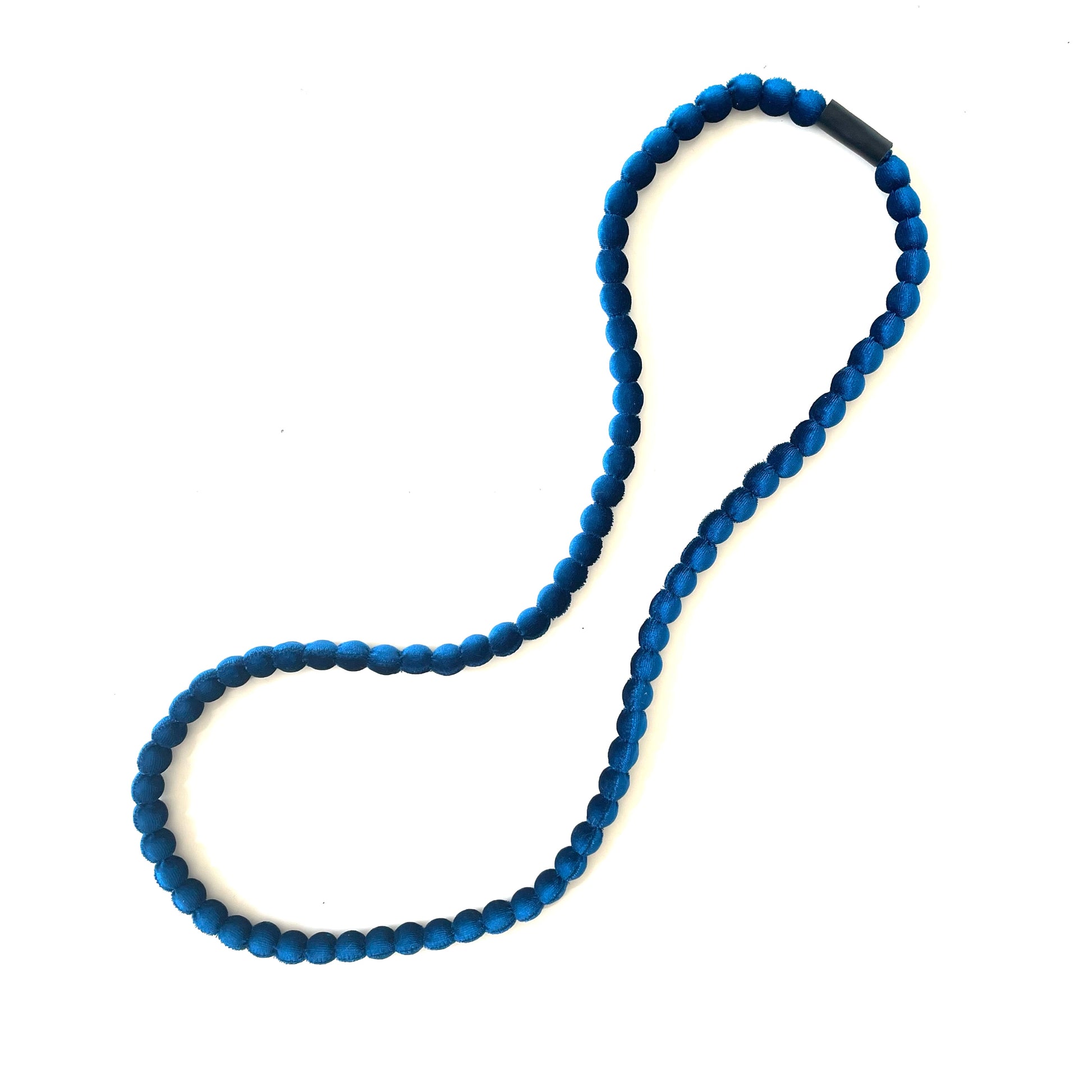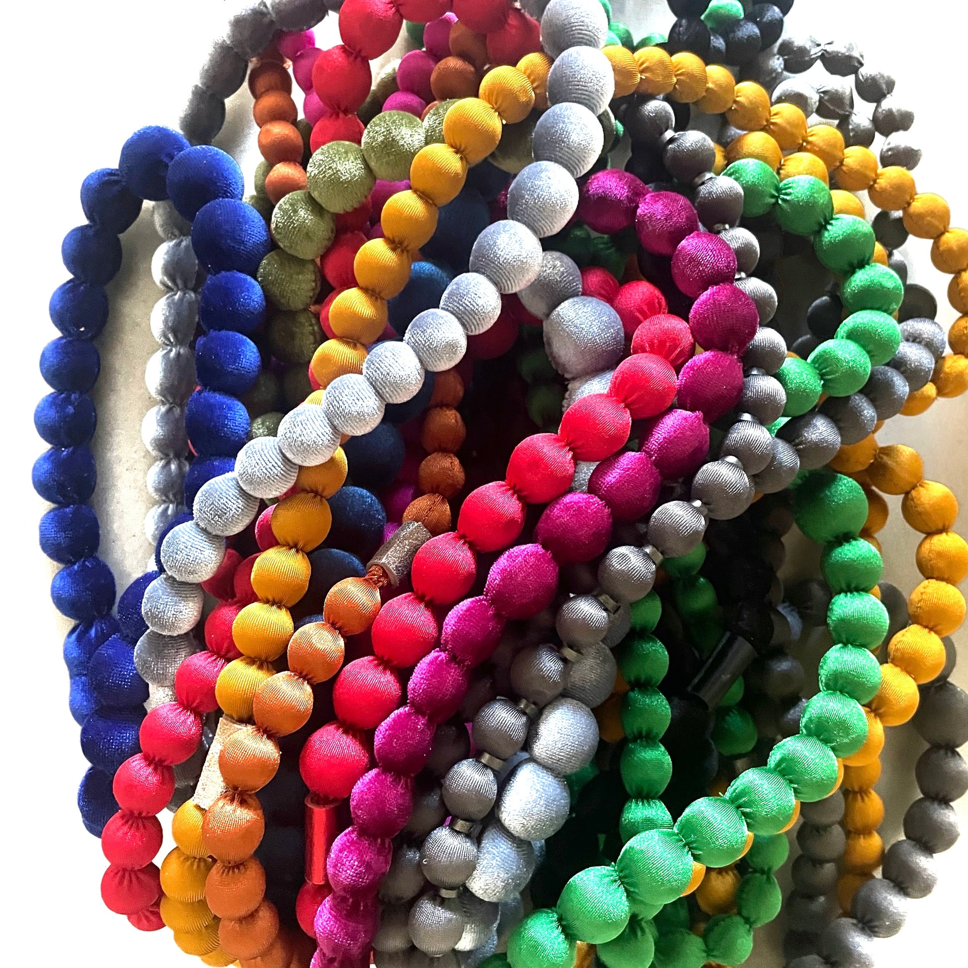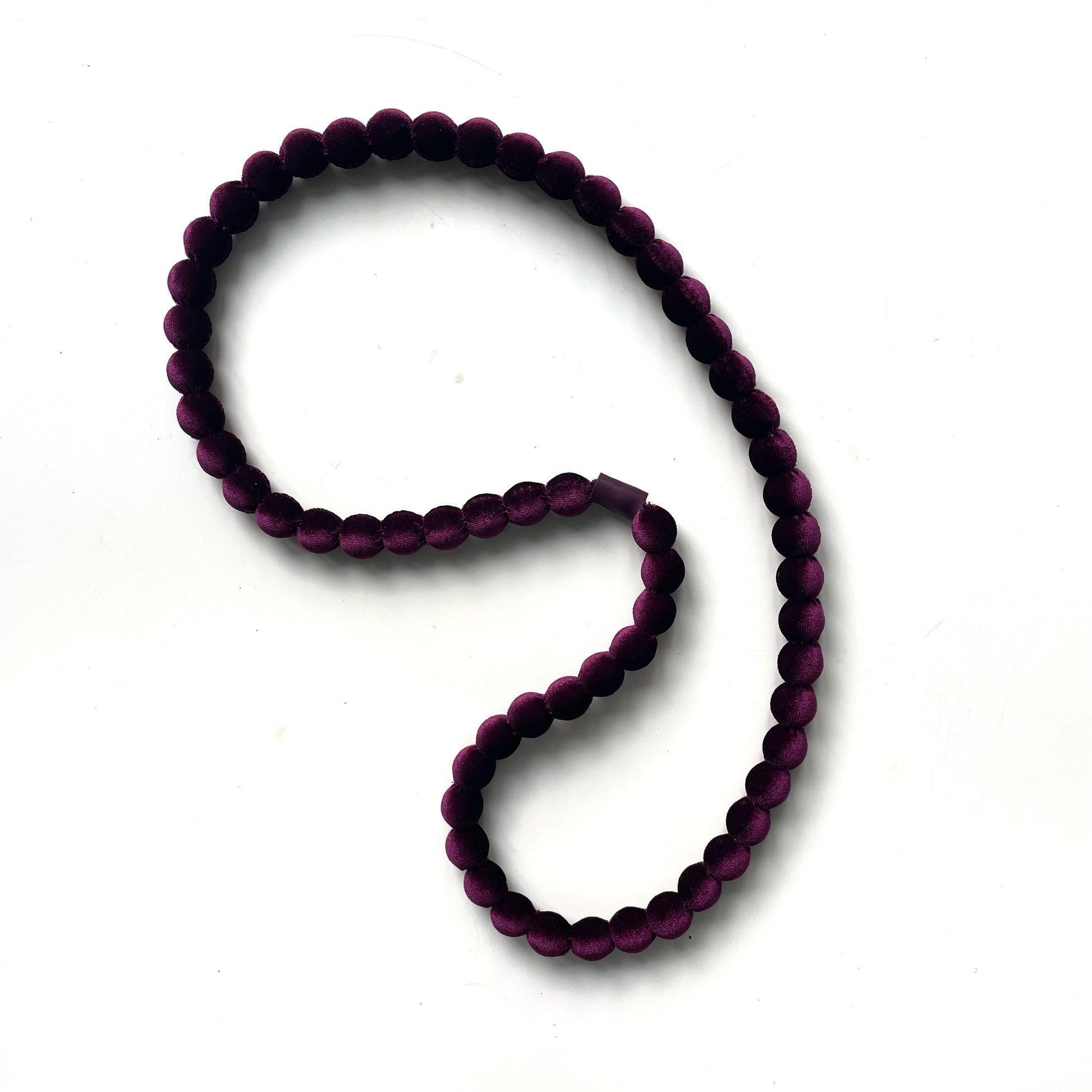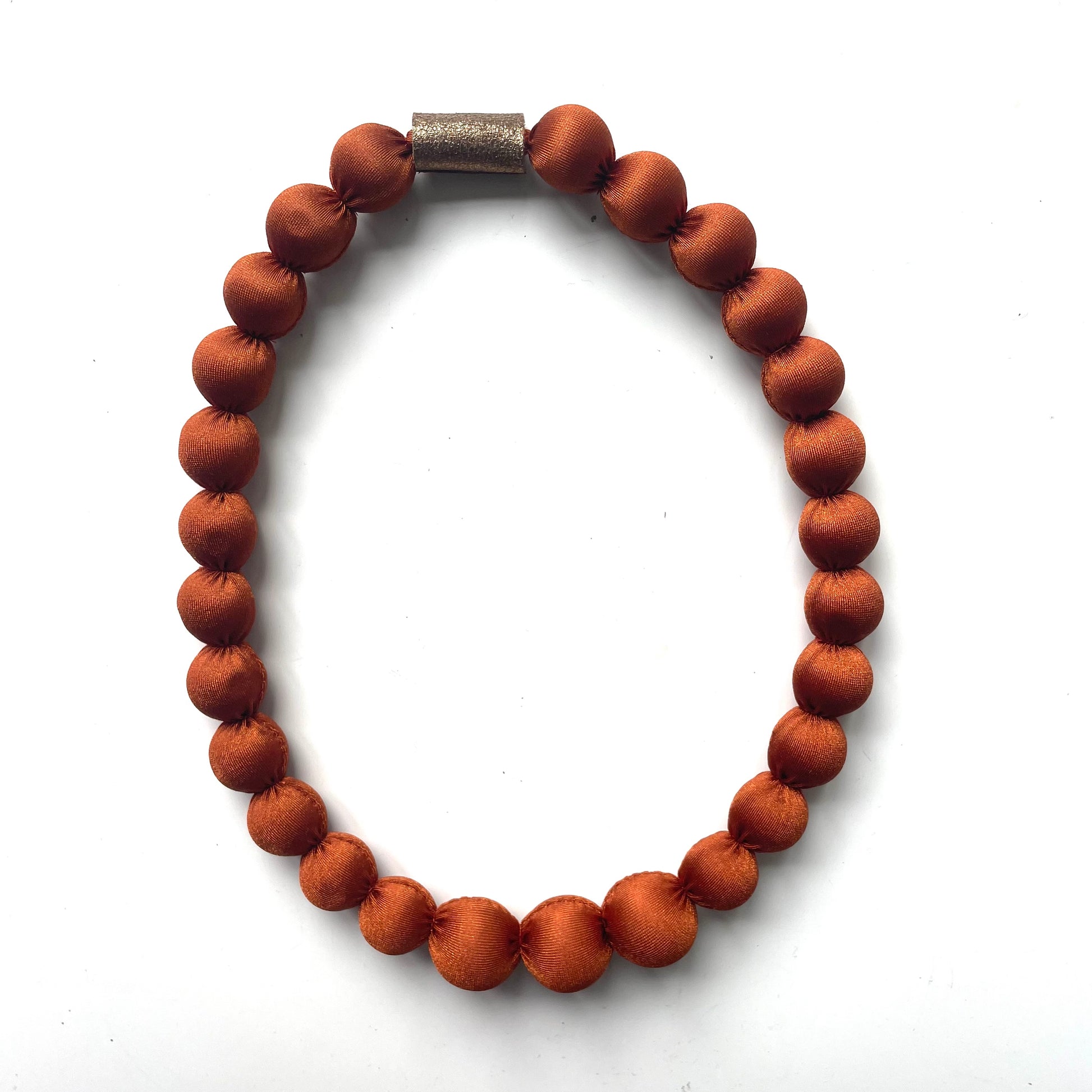 Collar de tela y pelotitas de madera. Es la versión moderna de un clásico collar de perlas. Existen cinco tamaños de cada color y los puedes mezclar para lograr combinaciones de colores, texturas y estilos.
