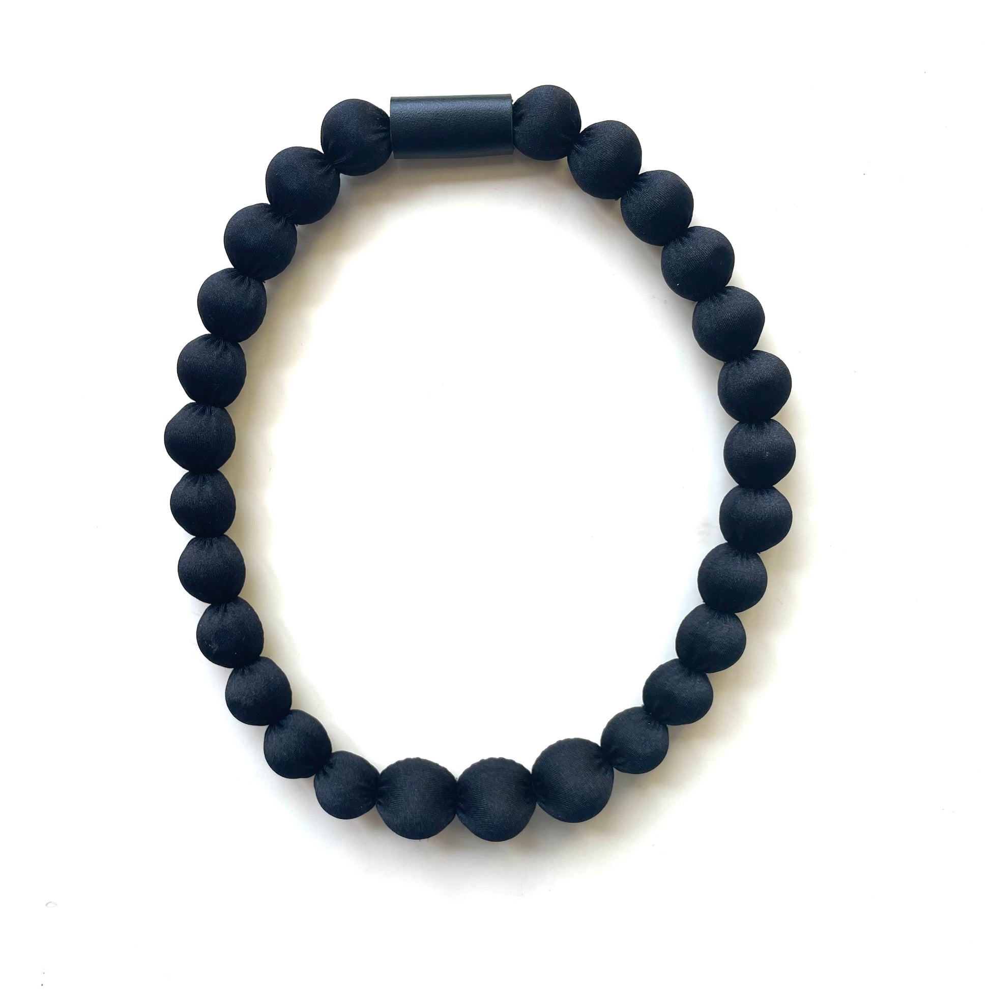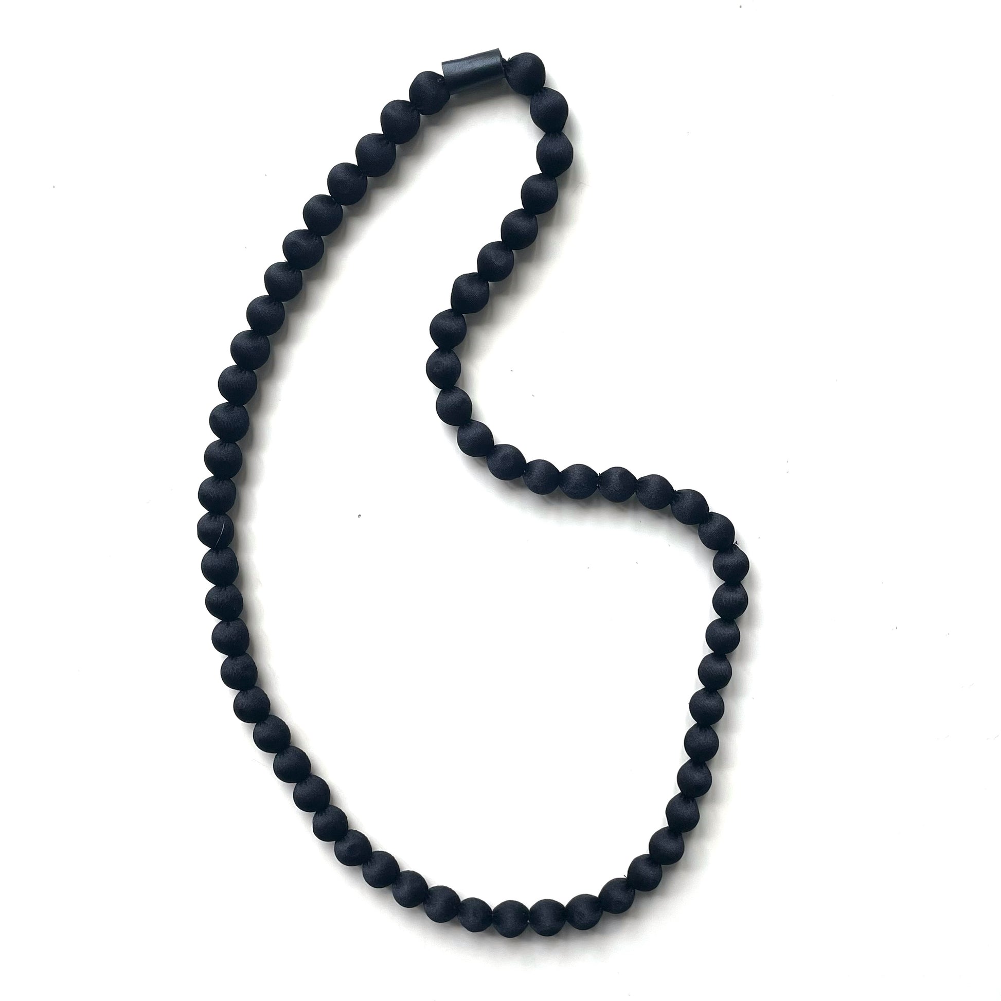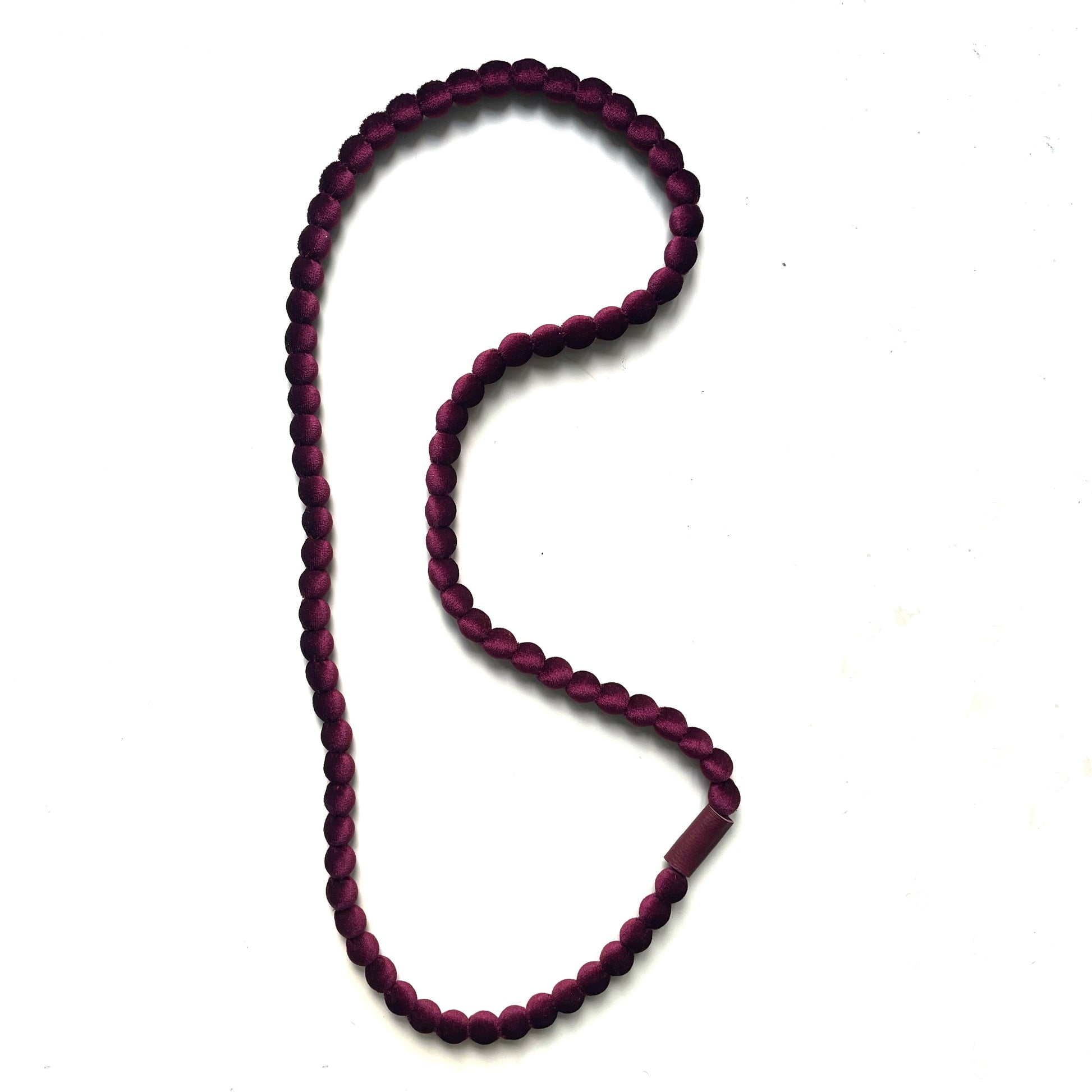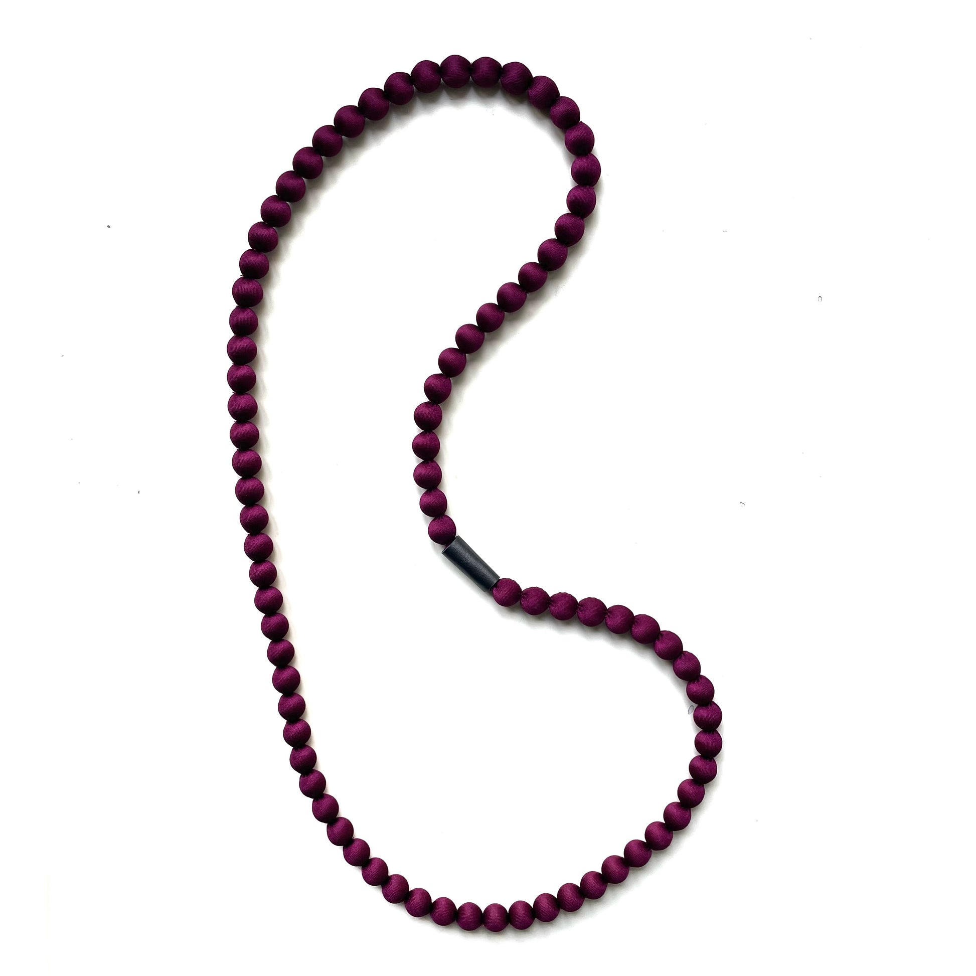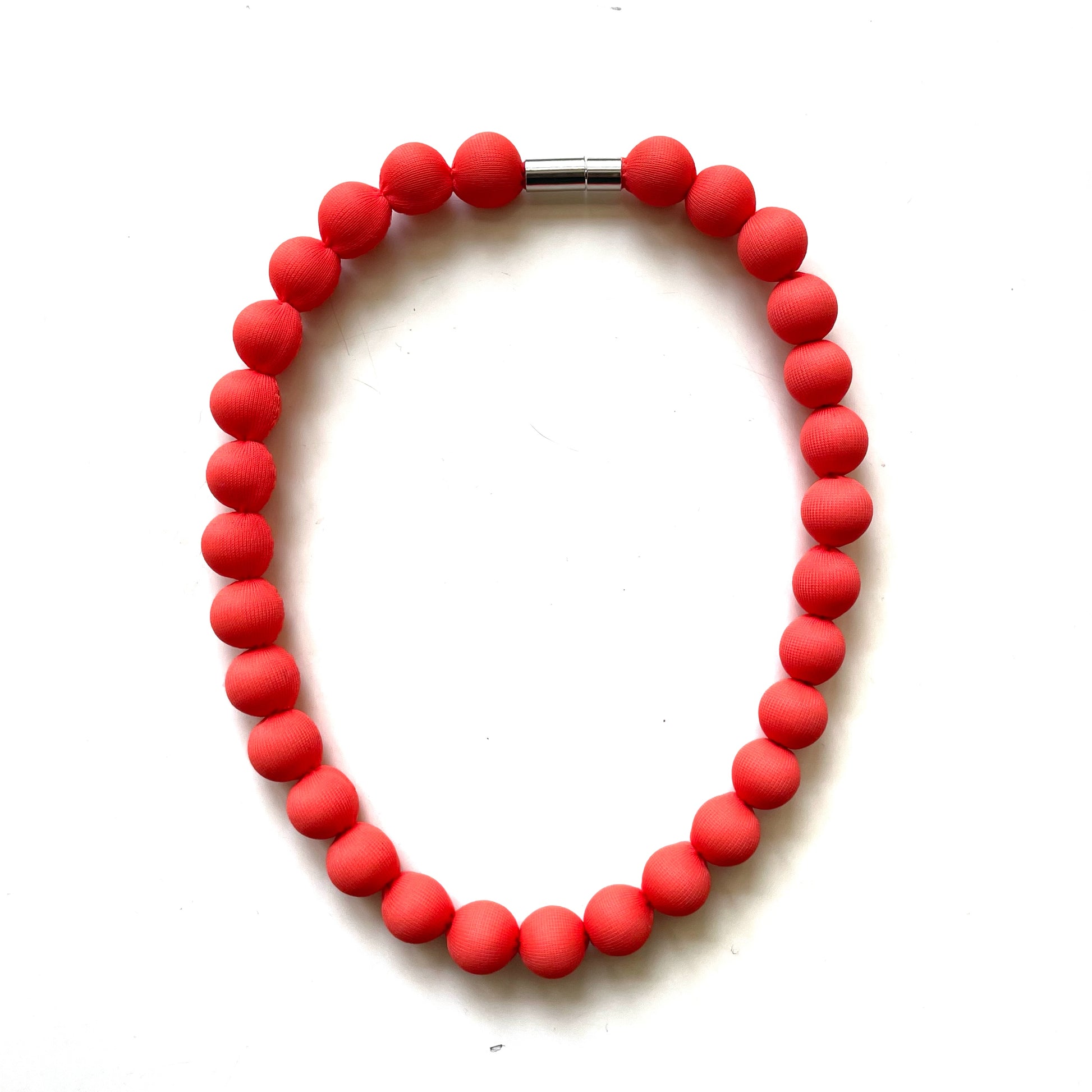 Collar de tela y pelotitas de madera. Es la versión moderna de un clásico collar de perlas. Existen cinco tamaños de cada color y los puedes mezclar para lograr combinaciones de colores, texturas y estilos.