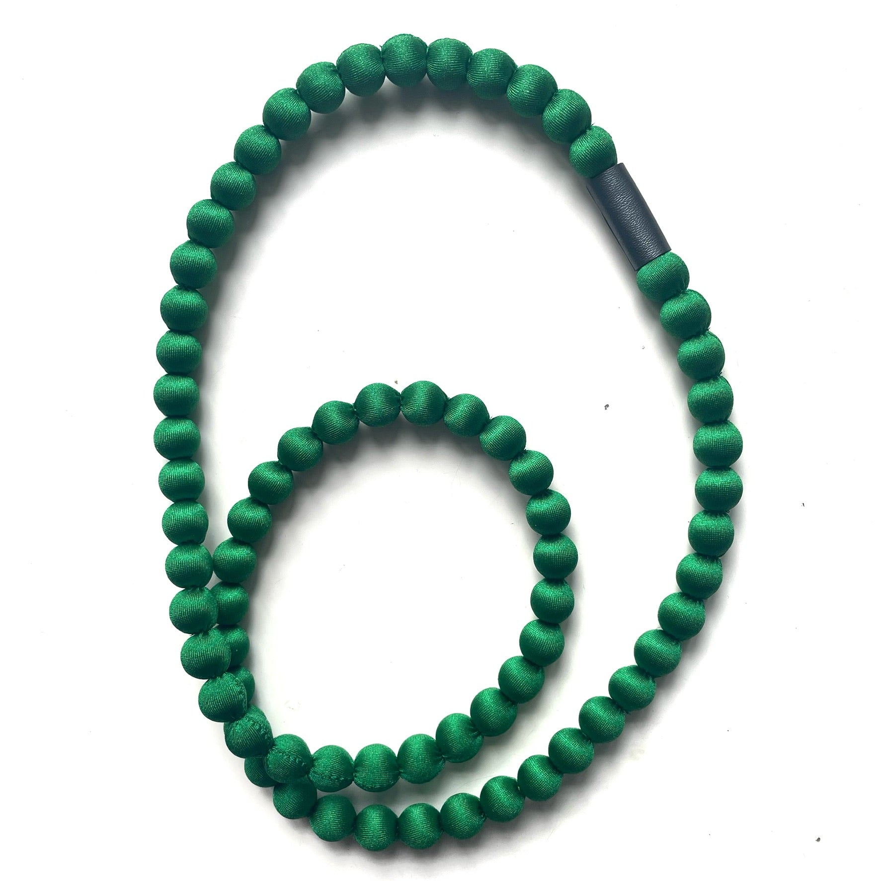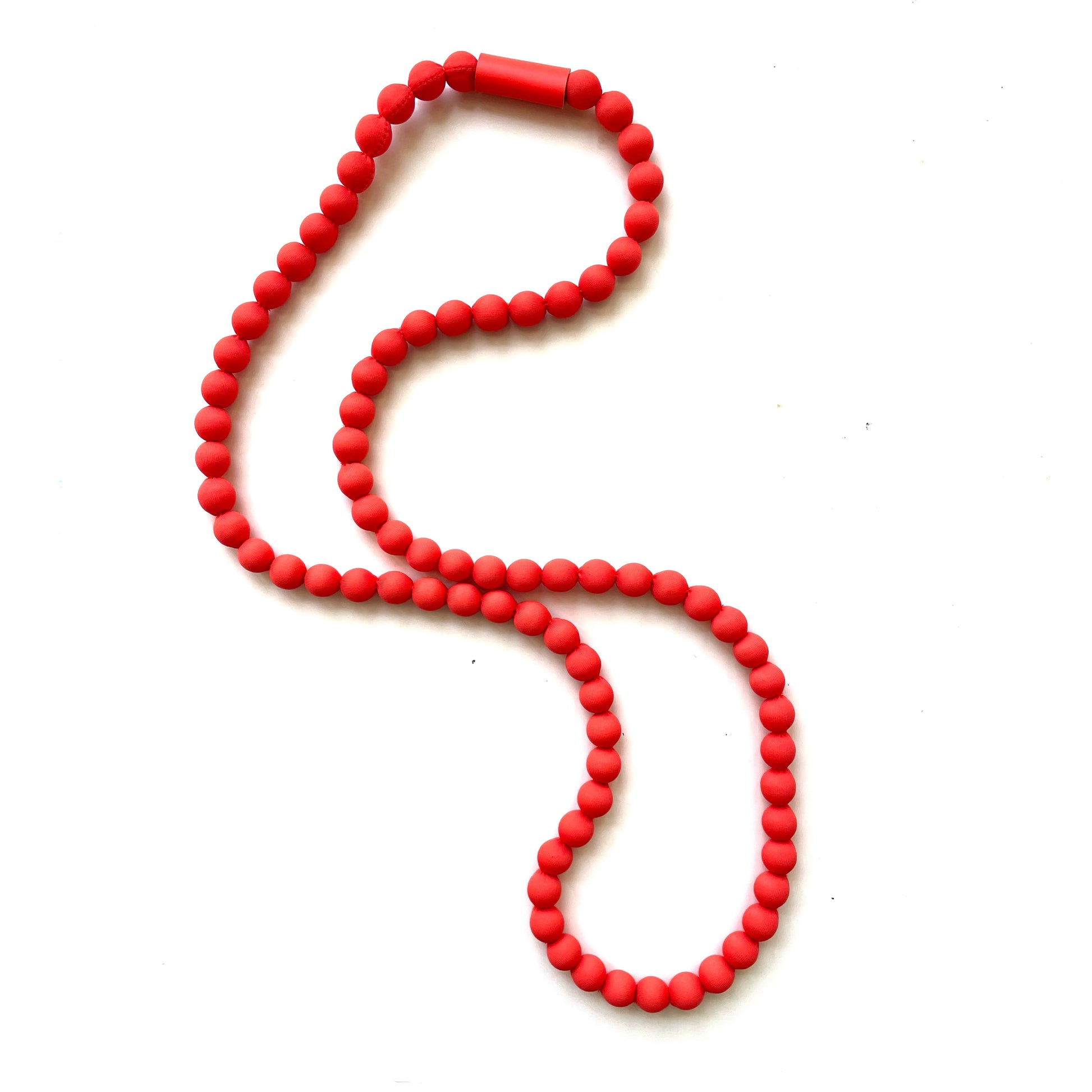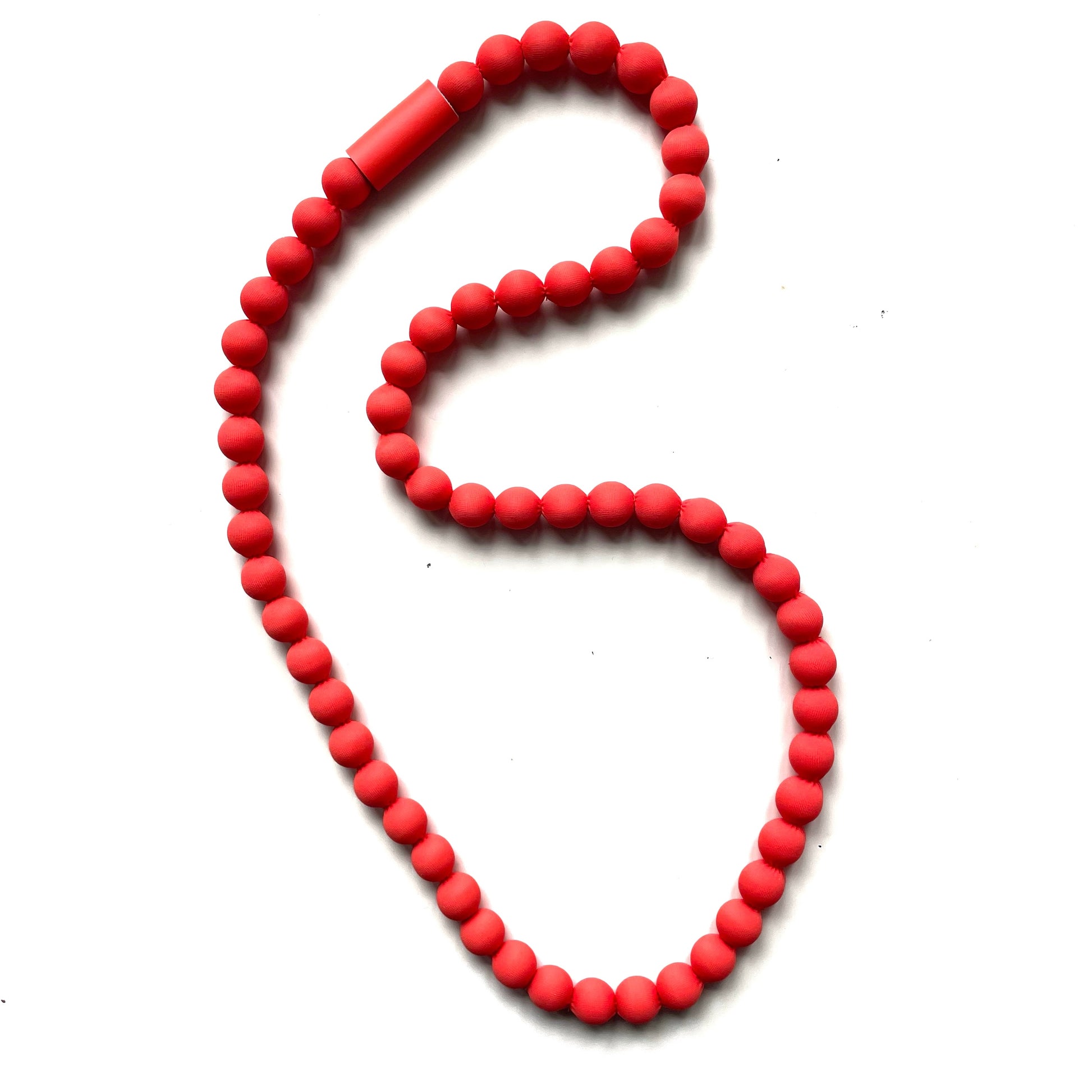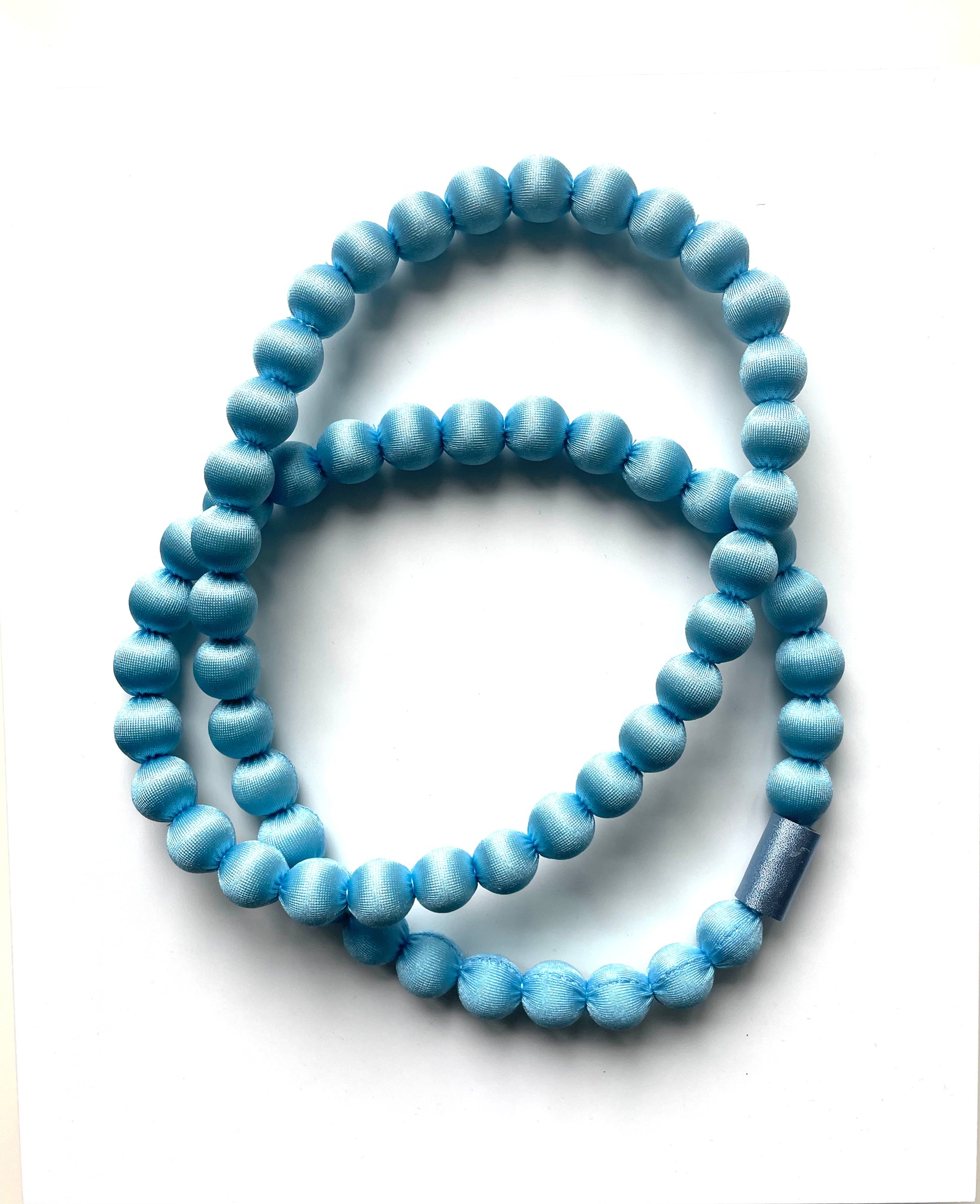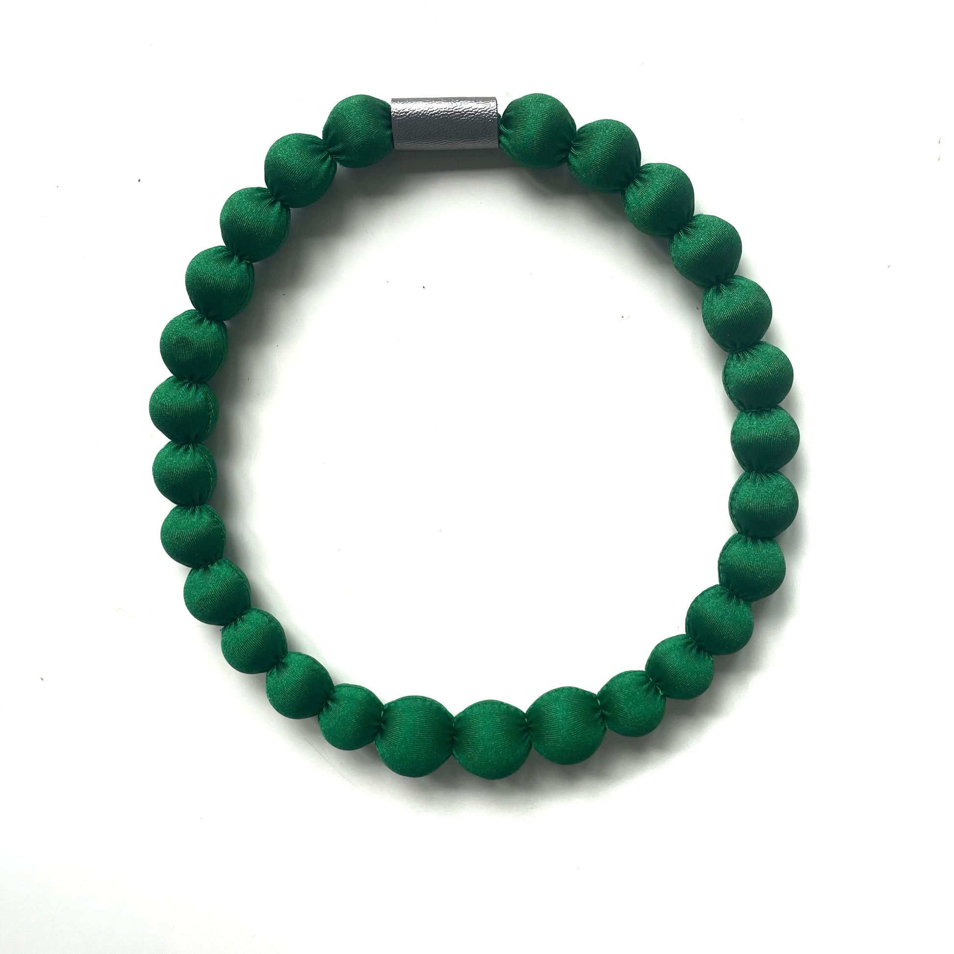 Collar de tela y pelotitas de madera. Es la versión moderna de un clásico collar de perlas. Existen cinco tamaños de cada color y los puedes mezclar para lograr combinaciones de colores, texturas y estilos.